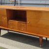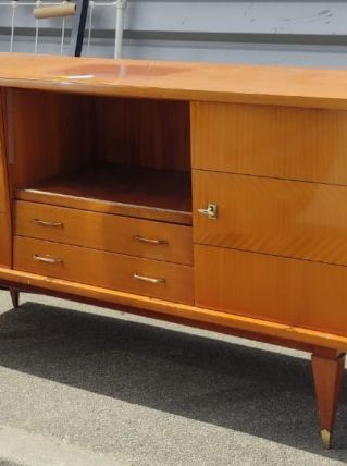 Elle est en bois clair laqué et repose sur des pieds compas.