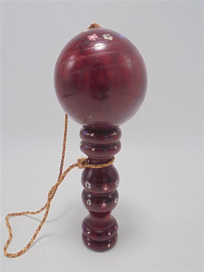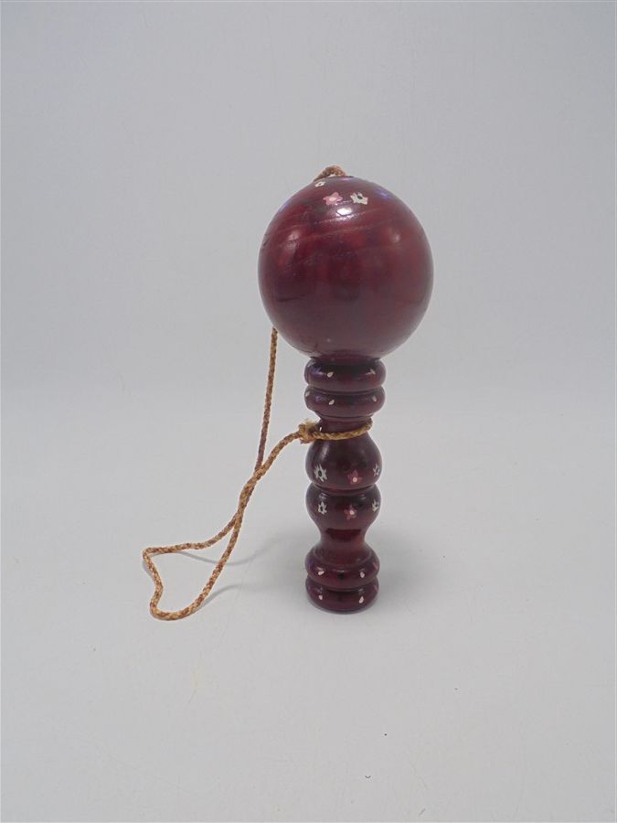 Bilboquet de couleur bordeaux/lie de vin décoré de petites fleurs.
