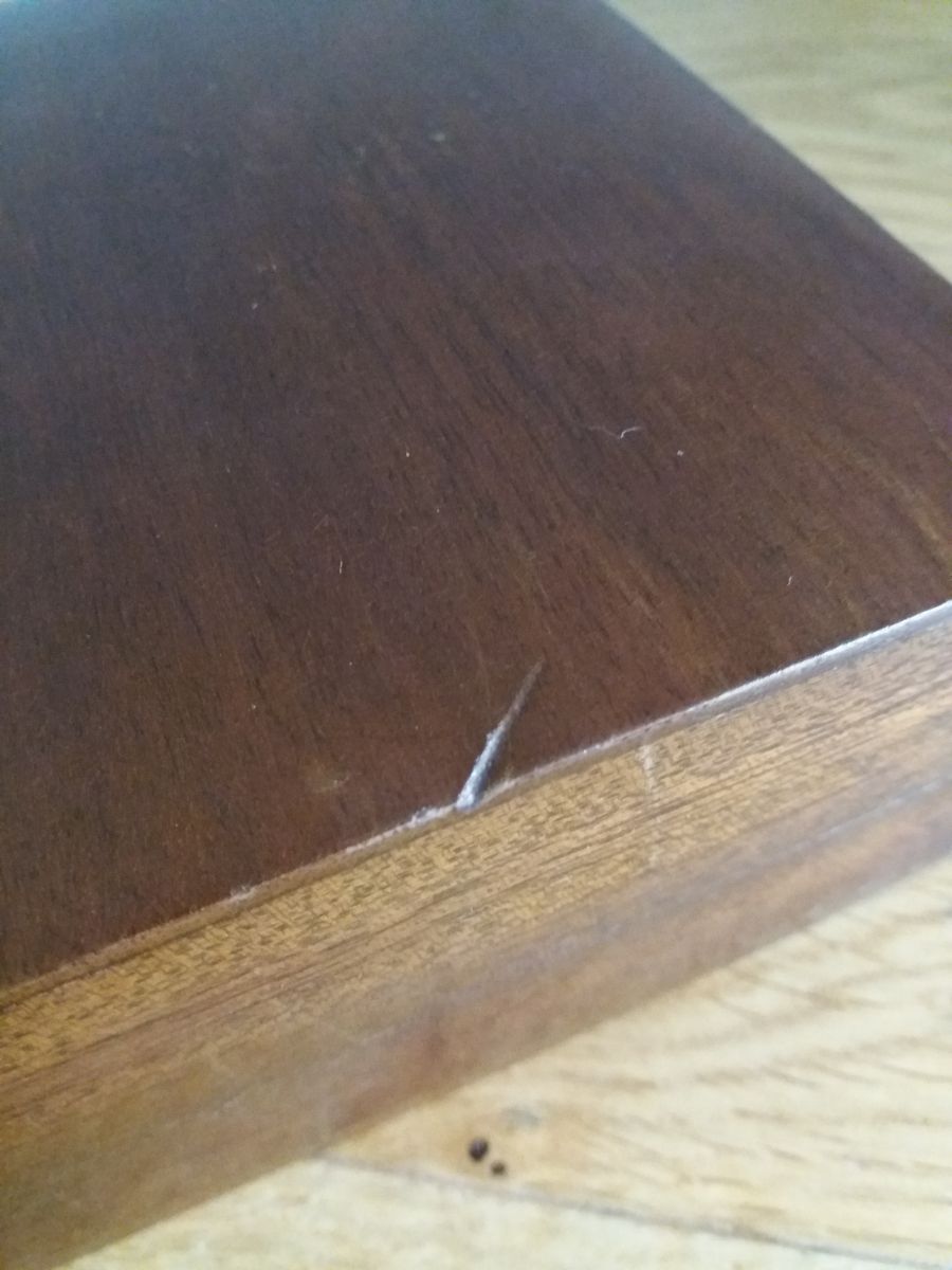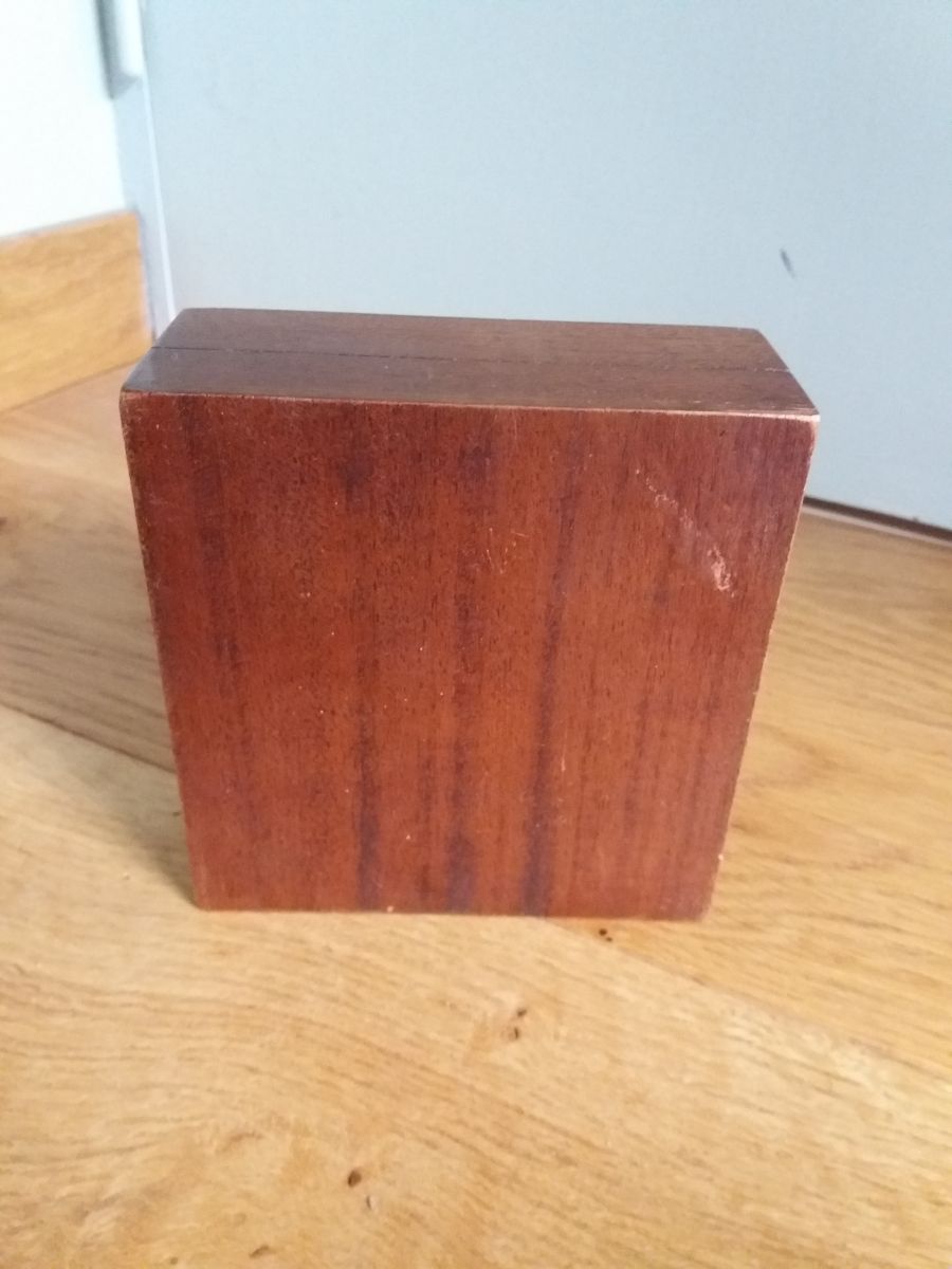 Charmante boite à cigarettes en bois avec un joli veinage (il me semble qu’il s’agit d’acajou mais sans certitude) et une charnière en laiton, dans un style art déco : sans fioritures, des lignes droites mises en valeur par le couvercle légèrement bombé. Elle comporte deux emplacements à cigares ou cigarettes, l’un fixe en partie basse, l’autre qui s’incline légèrement en partie haute. Elle date probablement des années 50 ou 60. Elle est en bon état général mais ne cache pas quelques signes de son âge : une marque de coup visible sur le devant, d’autres petites marques et rayures, principalement sur les côtés, et le vernis est un peu passé. Elle mesure 14 cm par 13 cm pour une épaisseur de 6 cm. Elle pèse 300 g.