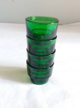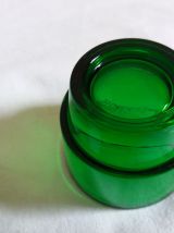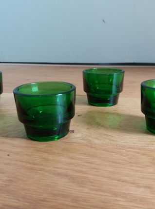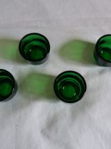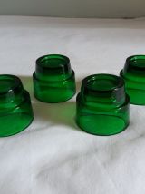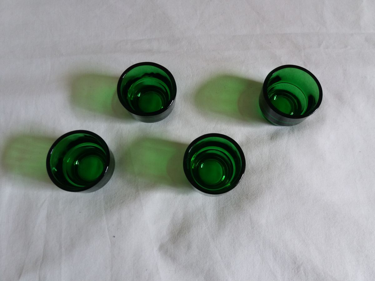 Charmant ensemble de 4 coquetiers en verre moulé de couleur vert bouteille de la marque Huilor, tellement typique des années 60 et 70. Ils sont plutôt prévus pour des œufs de poule assez gros même si cela fonctionne aussi pour ceux de plus petite taille. Mais ils pourraient aussi être utilisés pour présenter 4 condiments sur une table d’apéro. Ils sont en parfait état, ni fêle, ni éclat, pas même de rayures ! Ils mesurent 4 cm de hauteur, 5 cm de diamètre extérieur, et le diamètre à l’intérieur est d’environ 4, 4 cm.