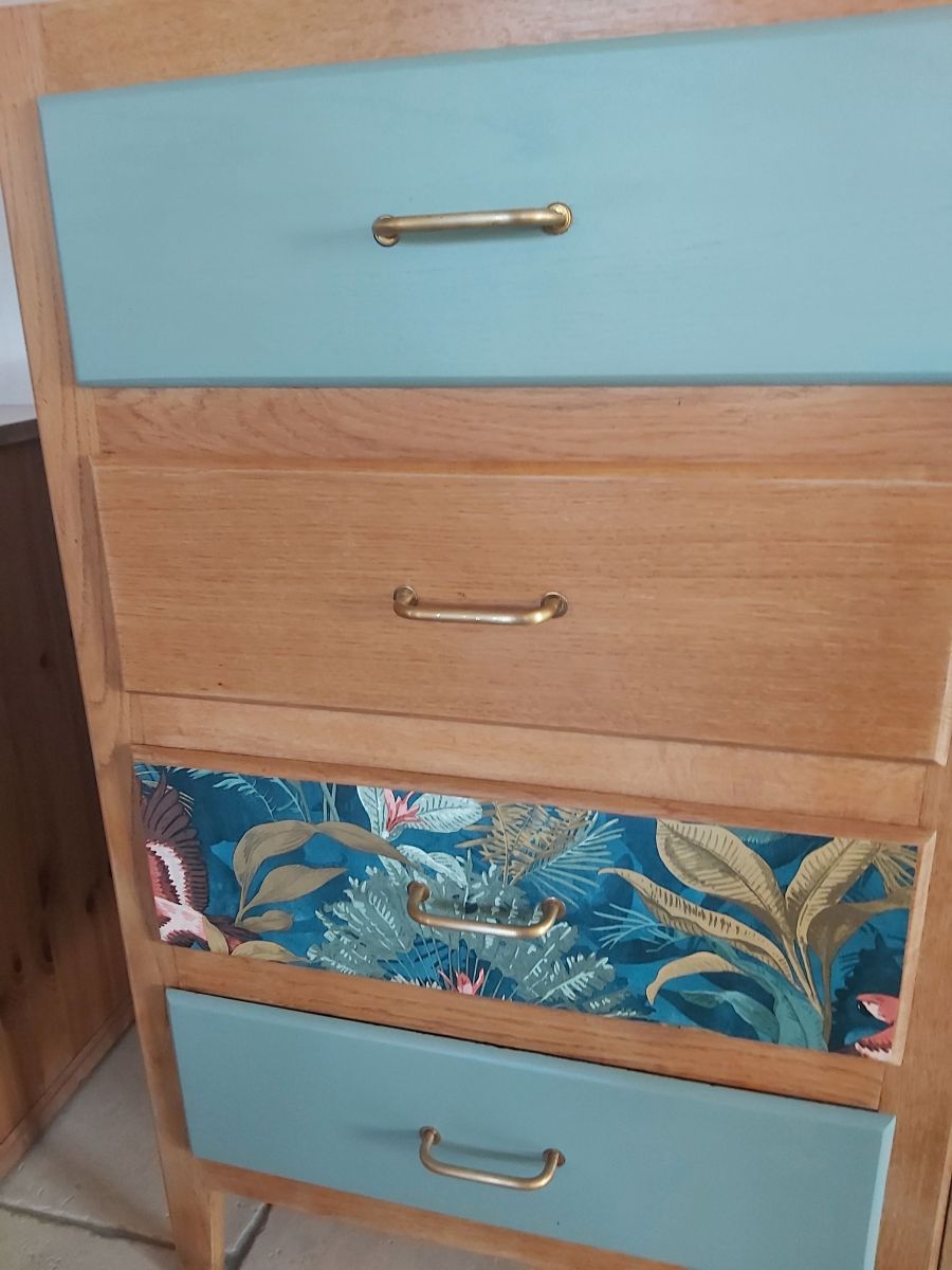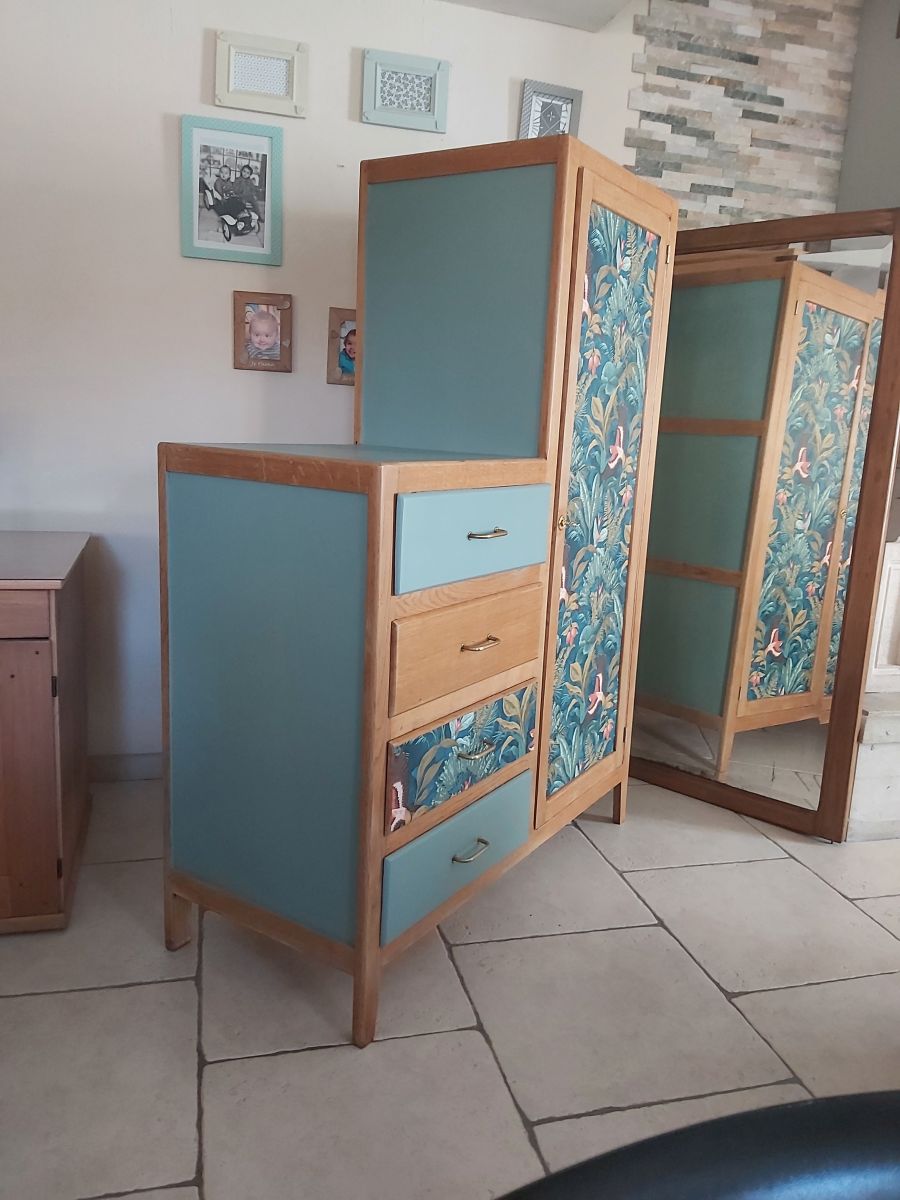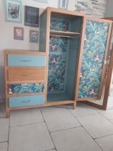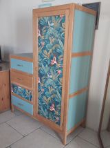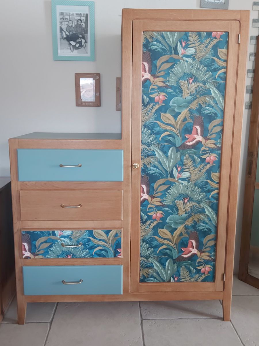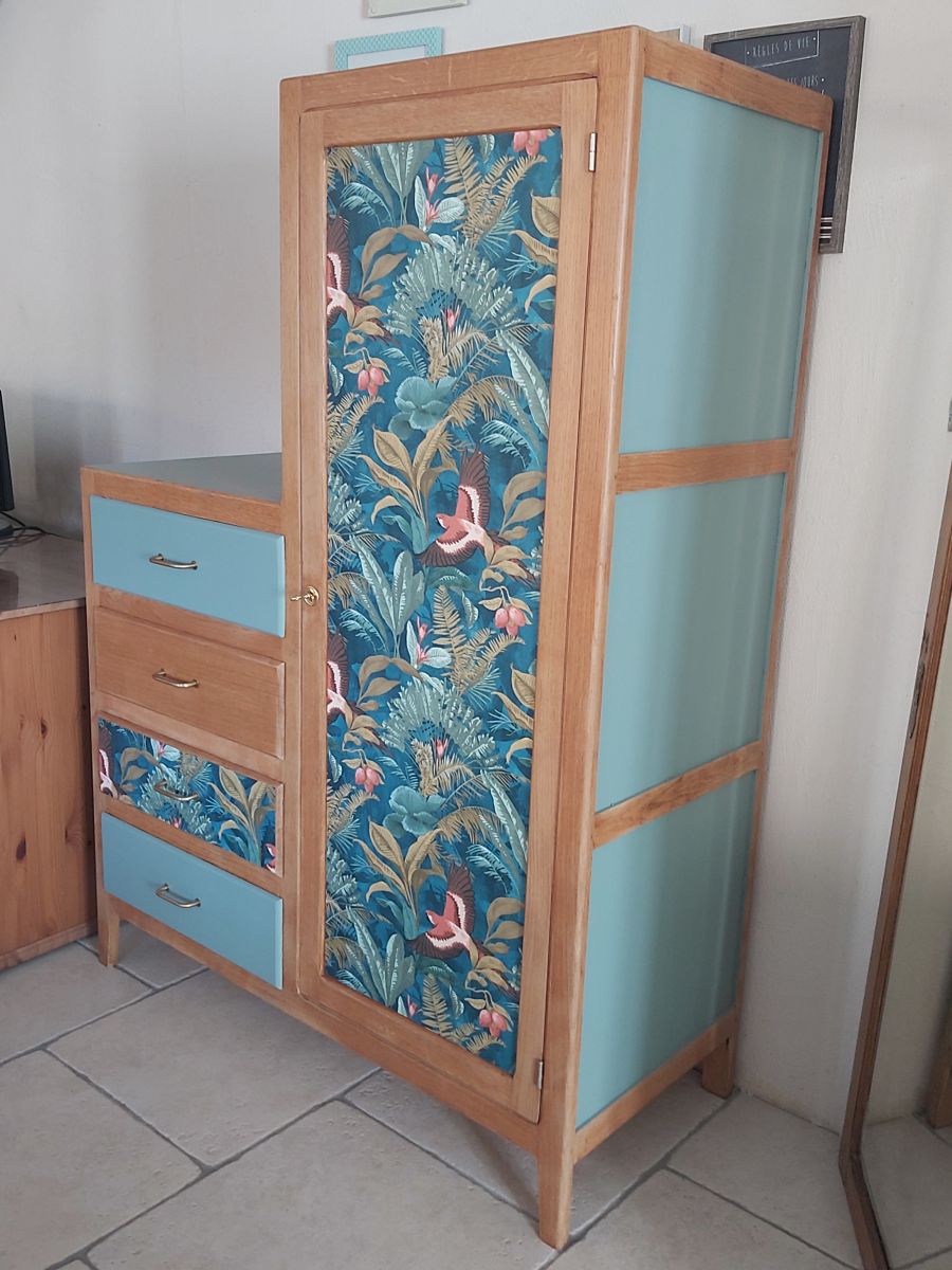 Jolie armoire entièrement rénovée couleur bleu sarcelle ,ornée de papier peint jungle multicolore, les parties bois sont vernies,la serrure est neuve et les poignées rénovées. Grande capacité de rangement avec ses 4 tiroirs et sa partie penderie, elle peut également servir de meuble d'entrée