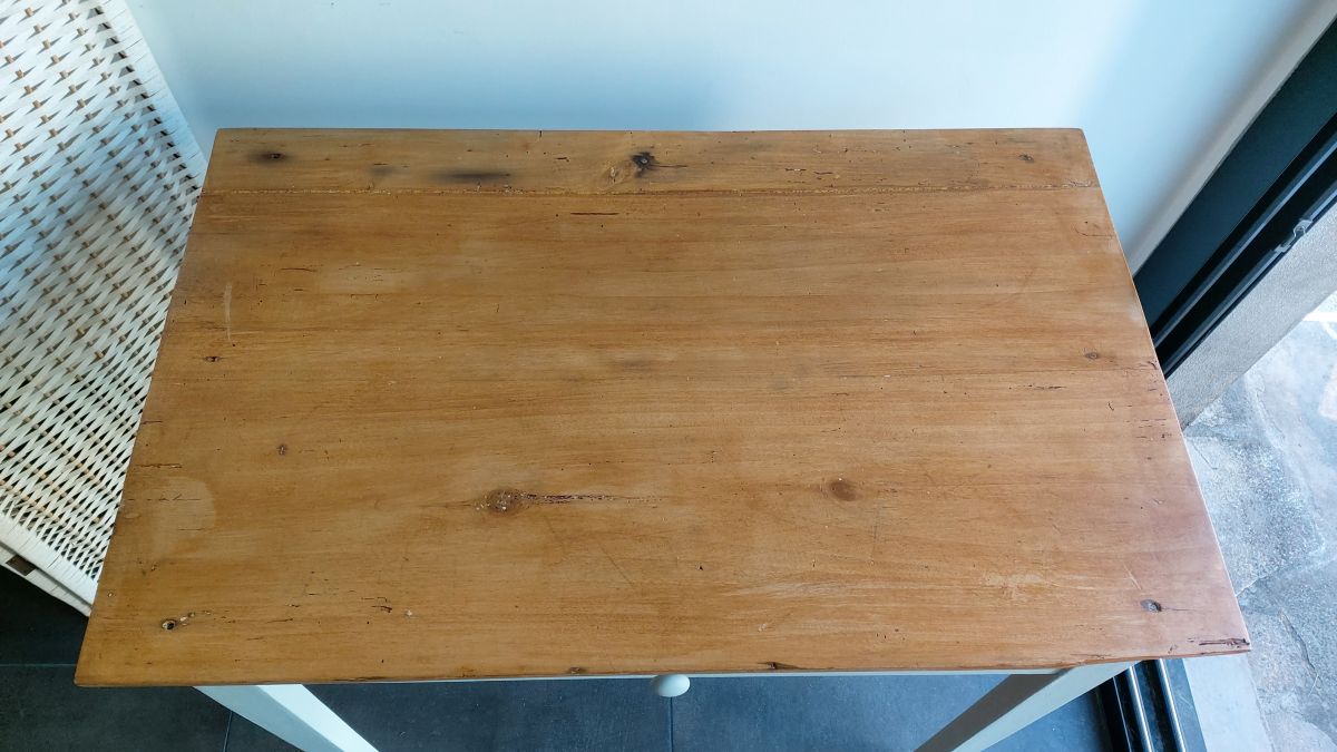 Elle garde des traces du temps et des utilisations, notamment un angle du plateau (avant droit) qui est légèrement tronqué. Son petit tiroir central est muni du bouton de tirage d'origine, en bois et repeint.