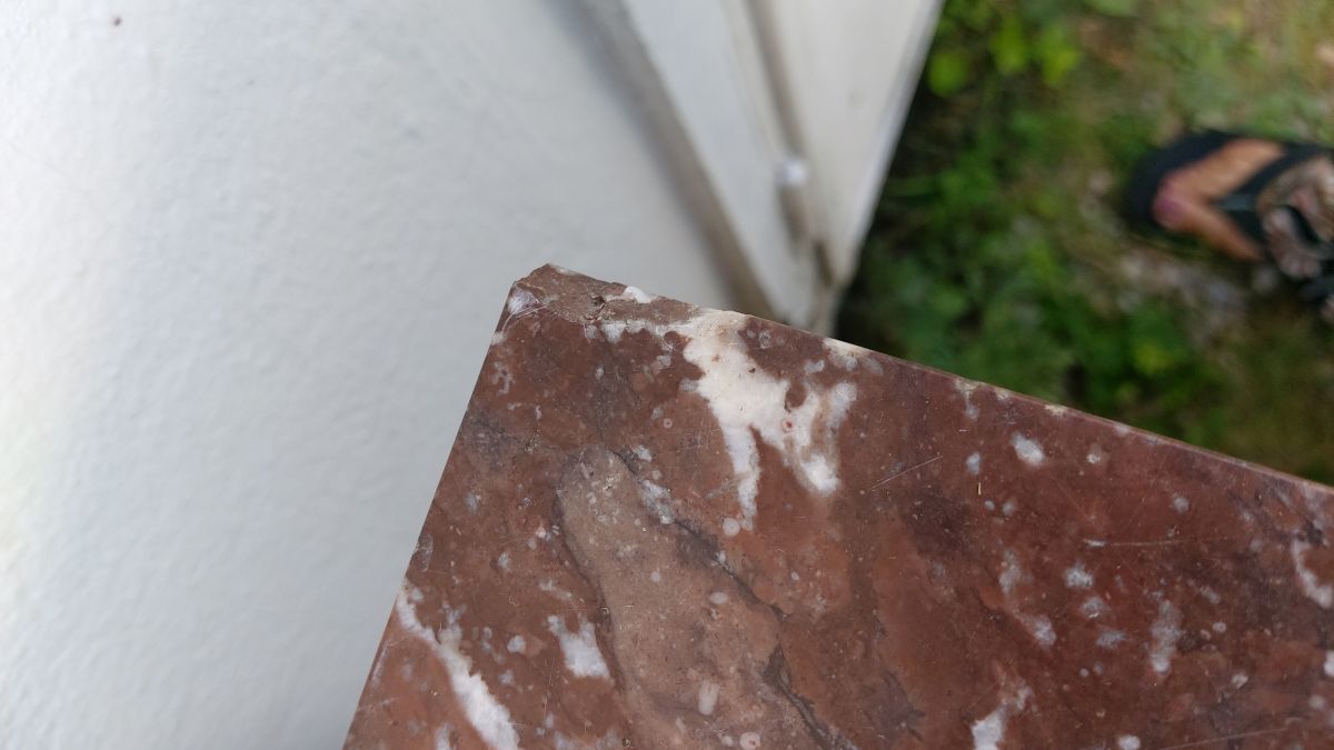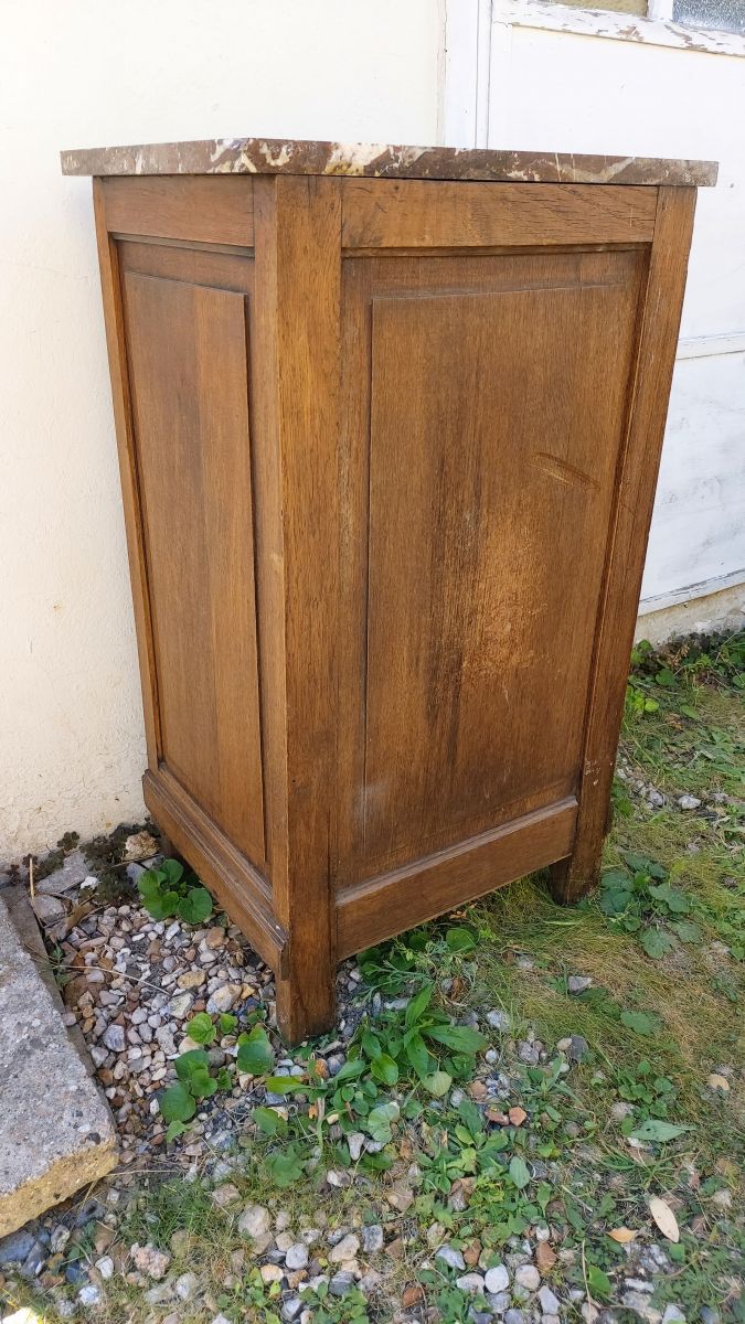 En bois massif, de bonne facture, il possède un beau plateau en marbre rose foncé veiné. Il est à noter que le marbre a une cassure qui est assez minime et peu visible sur le coin arrière droit (cf. photo).