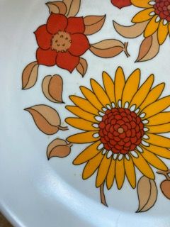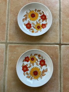 Sympathique lot de 2 assiettes en melamine avec leur décor de fleurs orange typique des années 70