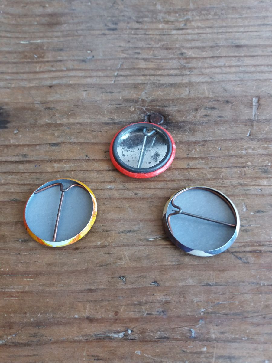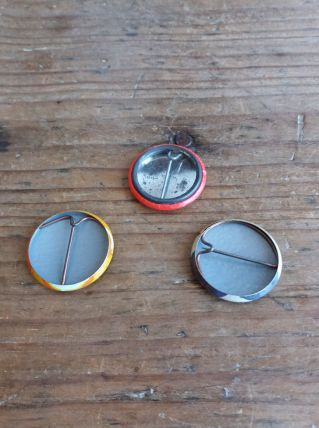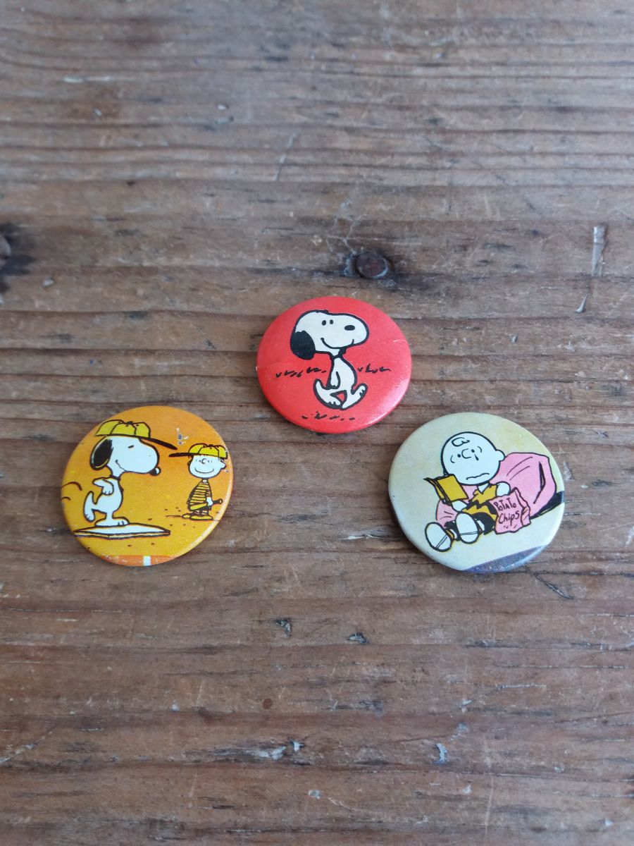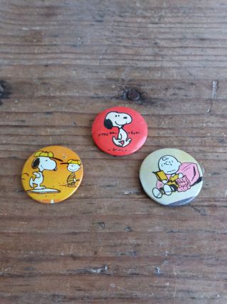 3 badges en métal plastifié à l’avant à l’effigie de Snoopy et/ ou Charly Brown et avec épingle à l’arrière, original des années 70 ou 80. Ils sont en bon état, l’un est un peu piqué en face arrière.