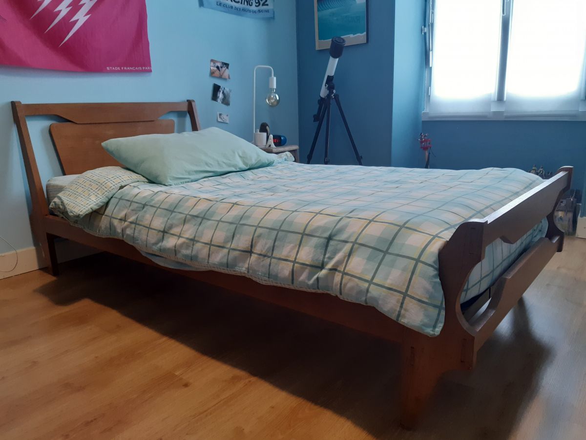 Vendu avec son sommier, son matelas et parrure de lit.