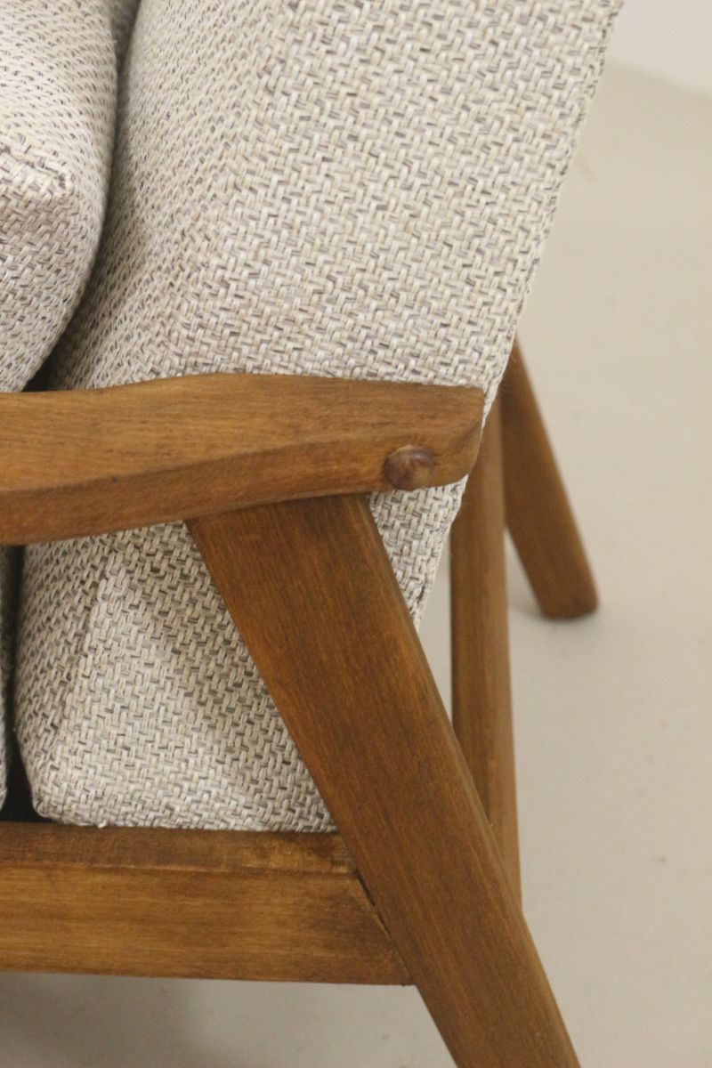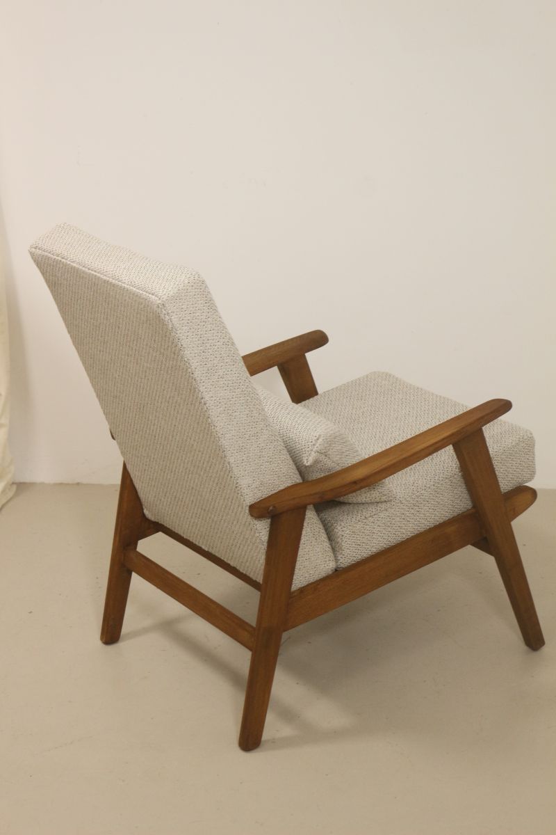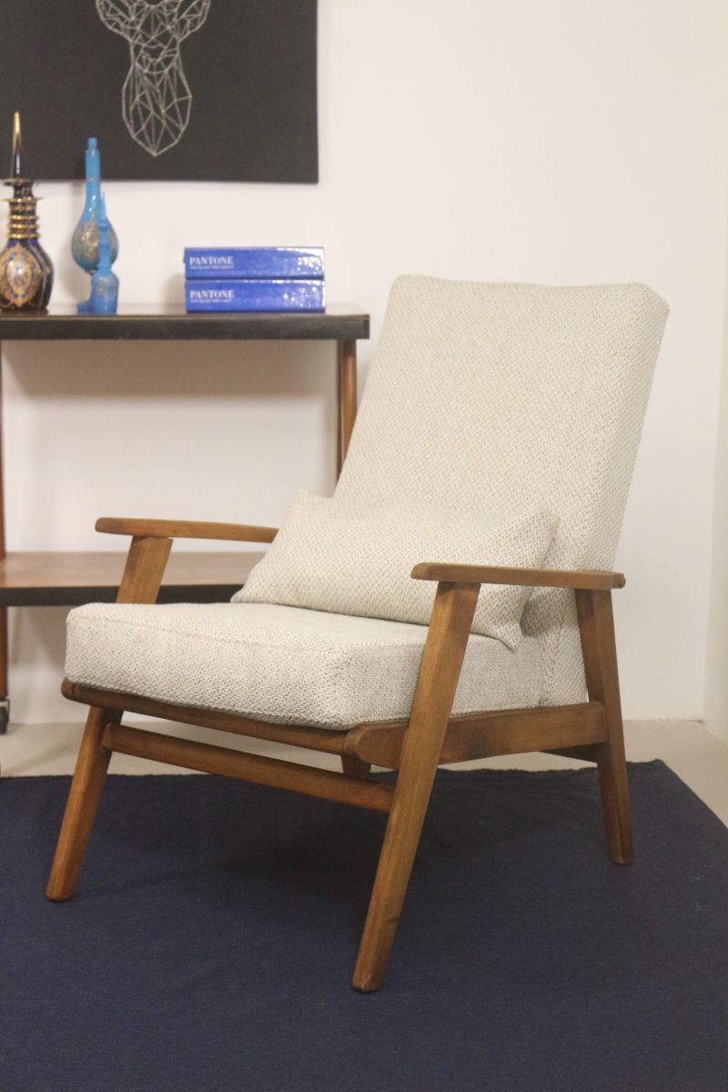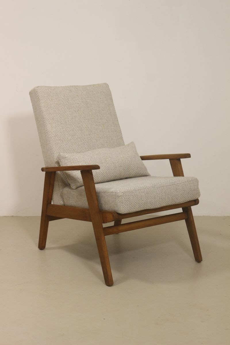 Fauteuil design scandinave 1960. Structures en hêtre dotée d’une architecture qui rallie forme, élégance et design. Beaux accoudoirs arrondis. Structure entièrement restaurée, assise et dossier nouvelle mousse, recouvert d’un tissu de couleur gris claire le coussin de l’assise est déhoussable. Qualité du bois est superbe, très belle veinure qui est soulignée par sa belle teinte. Dimensions: hauteur 80cm. Hauteur d'assise 42cm. Largeur 56 cm profondeur 70cm.