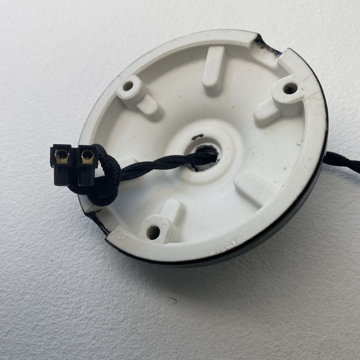 Electricité neuve avec fil noir en tissu torsadé. Prête à brancher par domino. Douille à vis en Bakélite gros culot (ampoule E27) et rosace de fixation en porcelaine.
