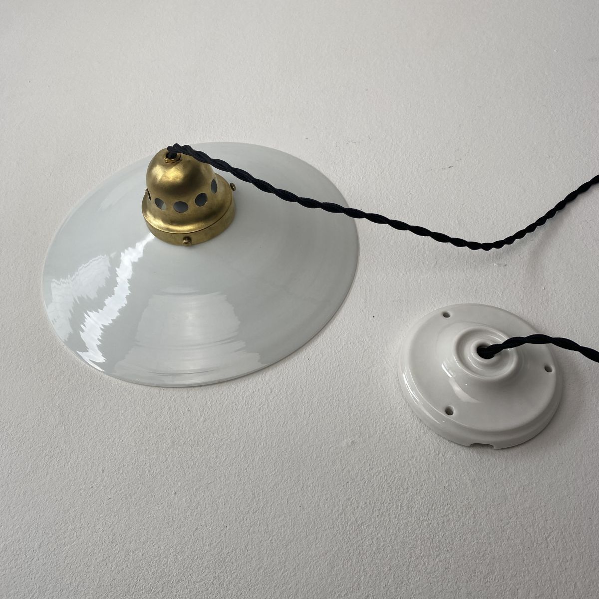 Electricité neuve avec fil noir en tissu torsadé. Prête à brancher par domino. Douille vis gros culot (ampoule E27) et rosace de fixation en porcelaine.