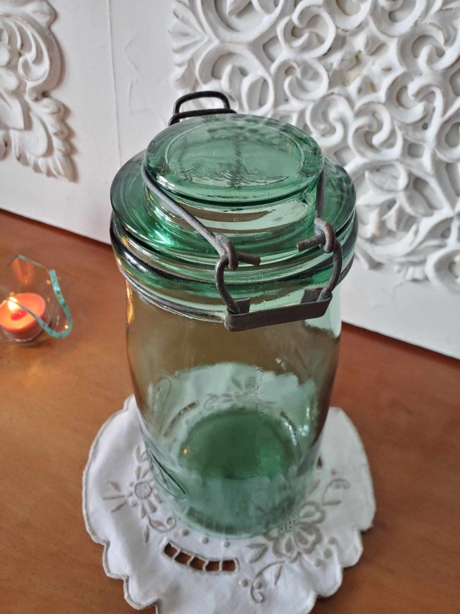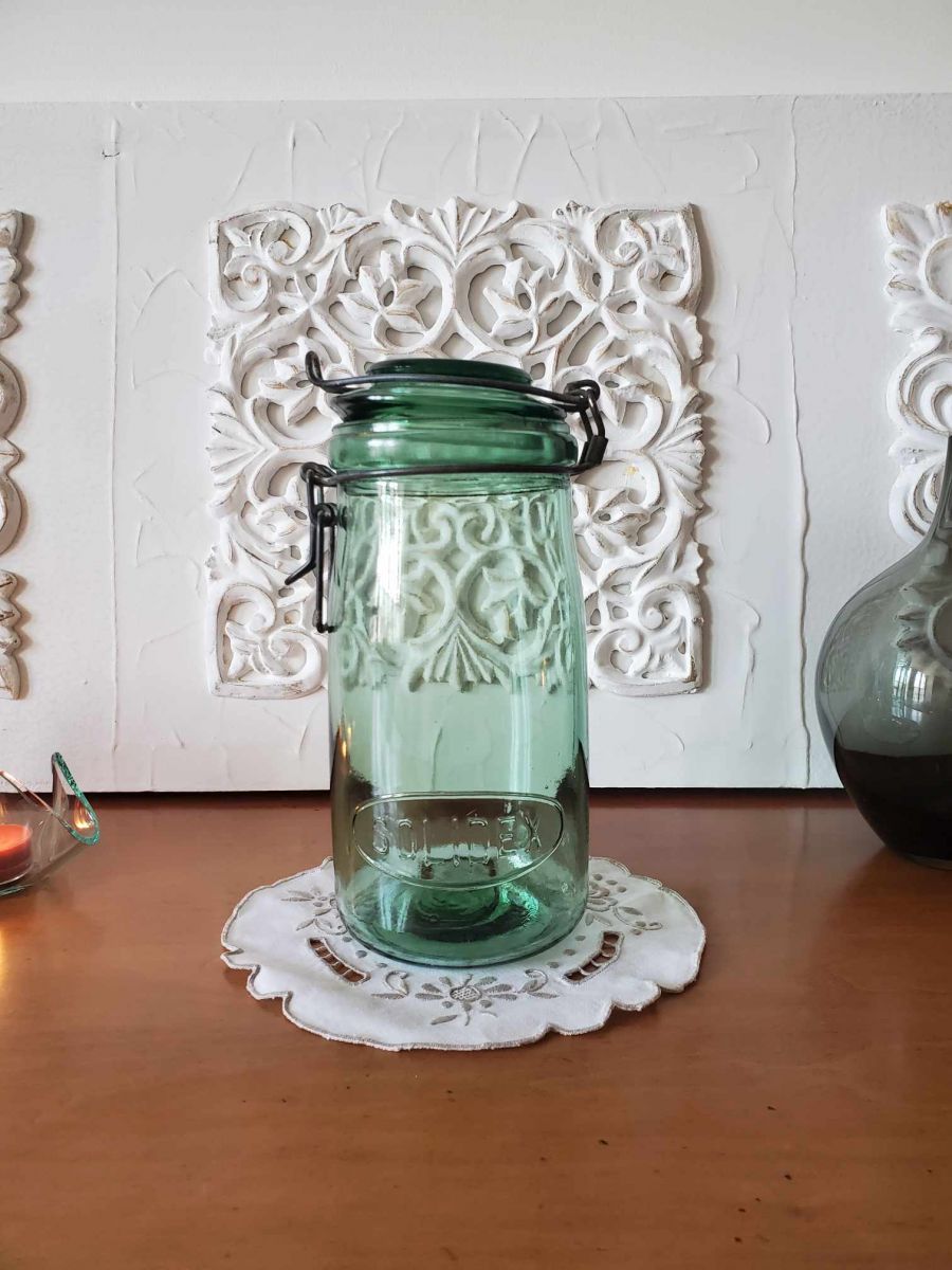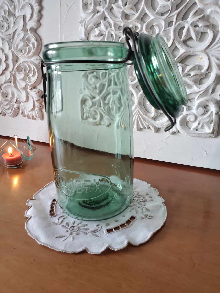 Bocal ancien en verre vert estampillé SOLIDEX en bon état