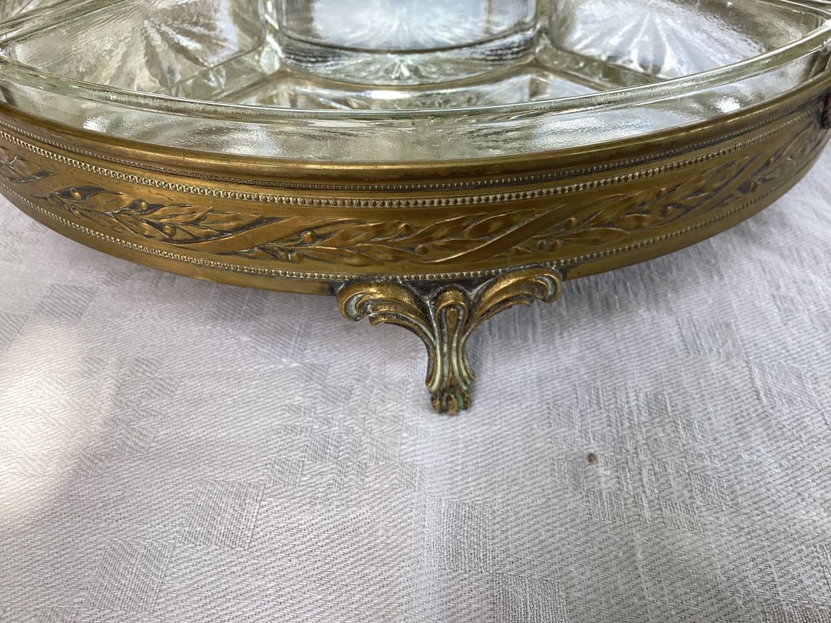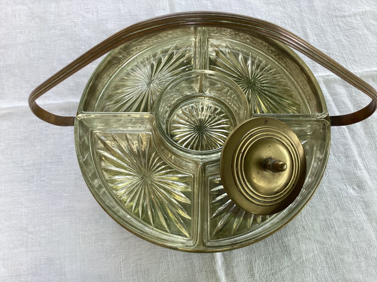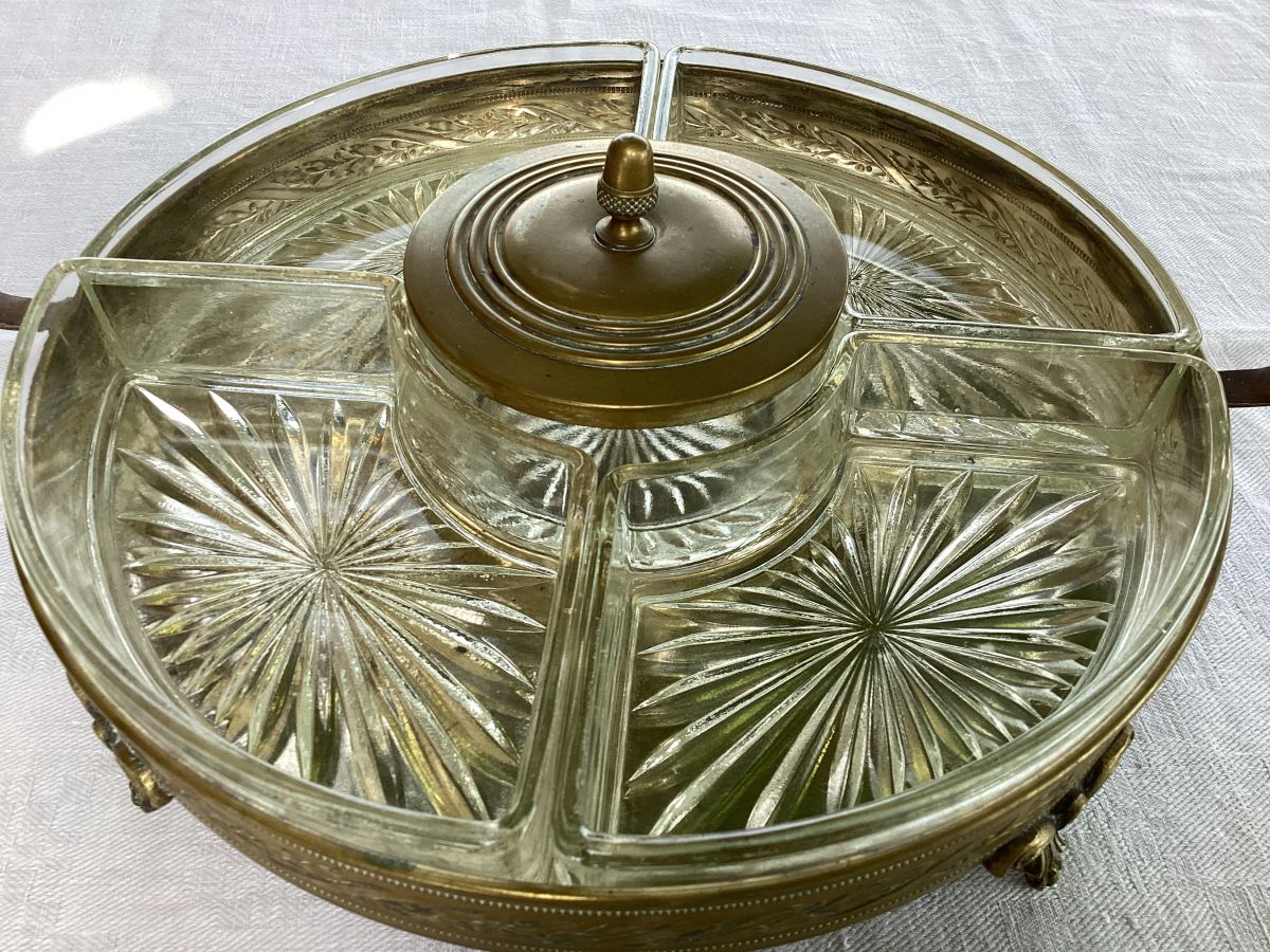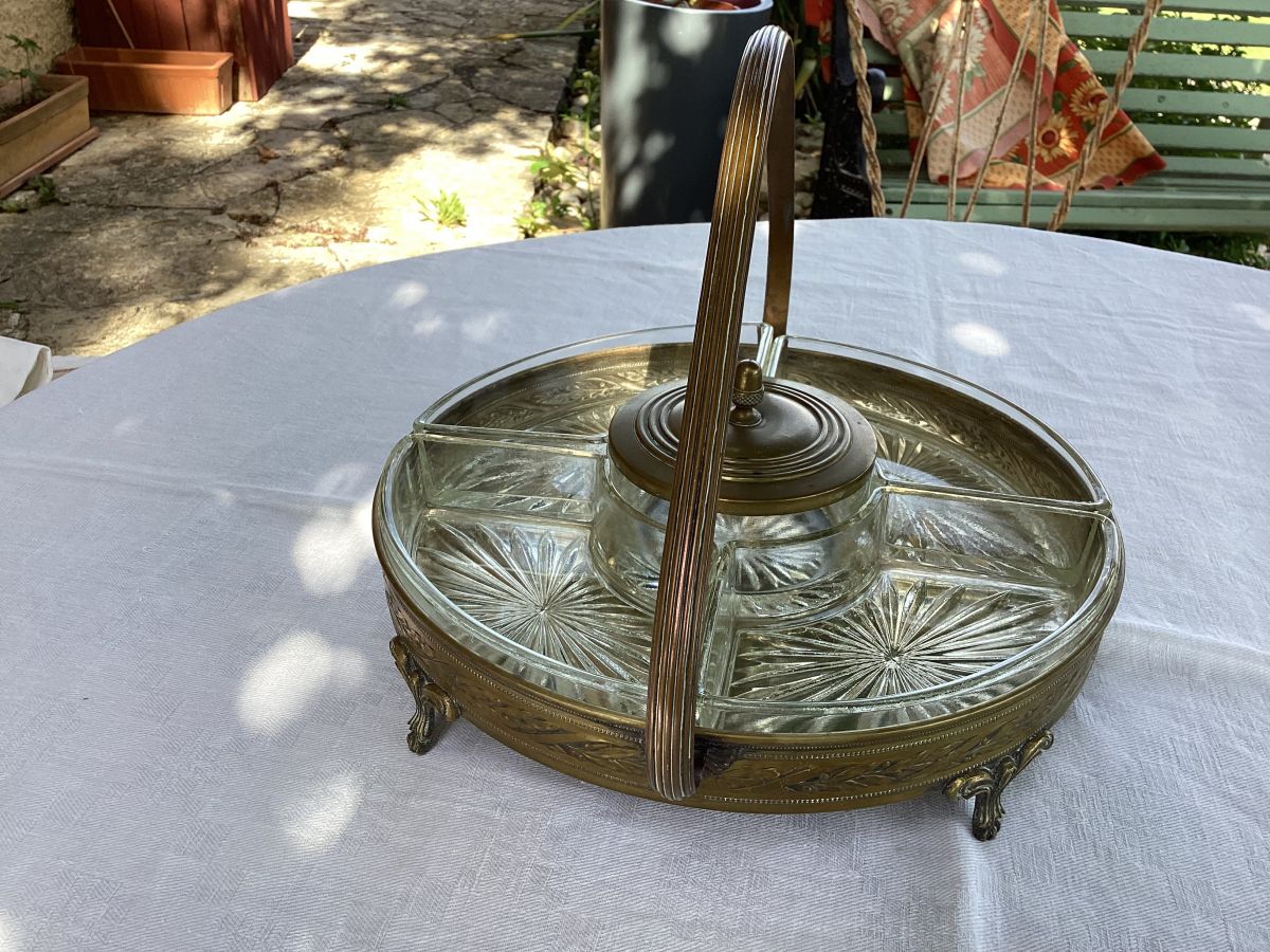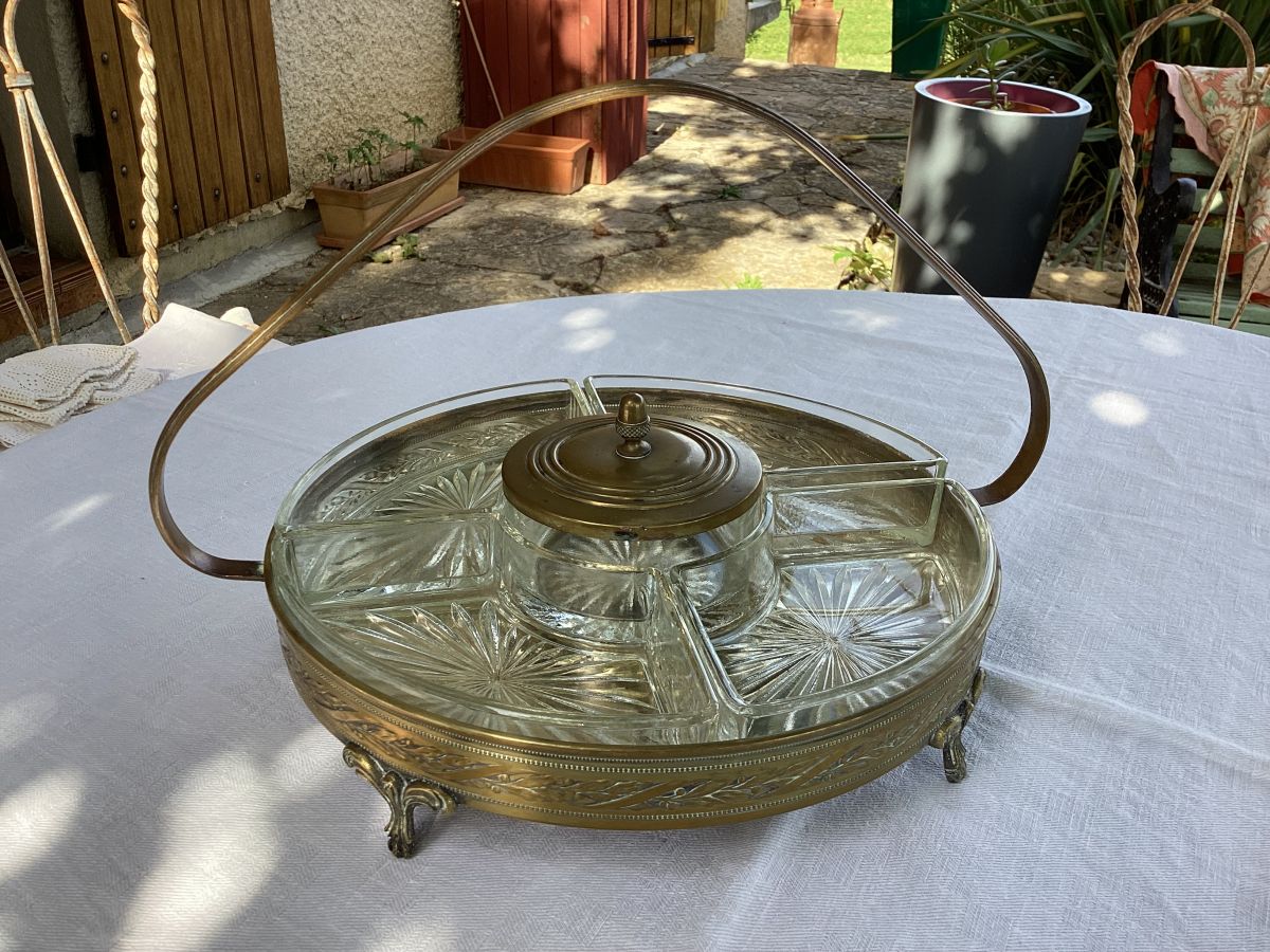 Serviteur art déco laiton et verre coupelle en parfait état. Plateau sur quatre petits pieds diamètre du plateau 25 cm, hauteur du plateau 6 cm. Hauteur total 20 à 22 cm.