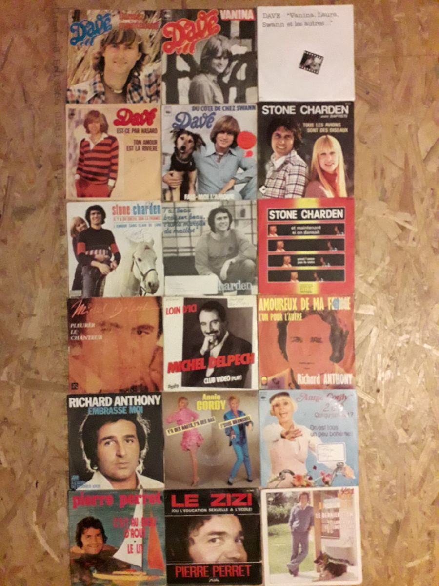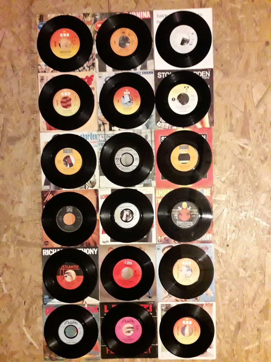 Bonjour à tous je mets en vente un lot de 18 vinyles 45t de Variétées Française à 9€ le lot soit 0.50€ le vinyle, vinyles en bon état et nettoyés et pochettes certaines usée par la durée et écrites voir photos pour plus de renseignements laissez moi un message merci cordialement