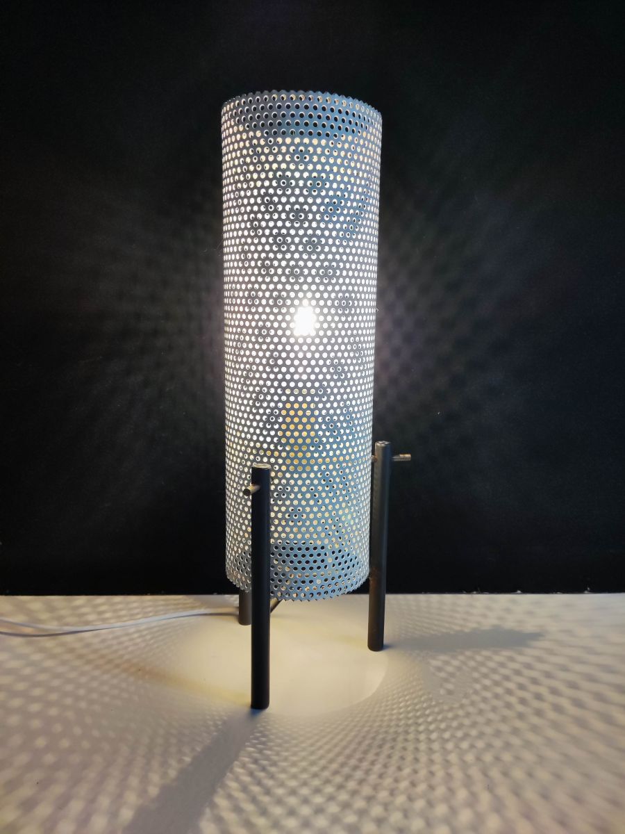 lampe tripode vintage des années 50 style Matégot, pied métal et laiton, abat-jour métal ajouré