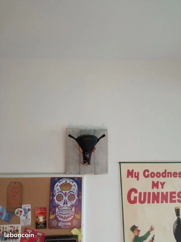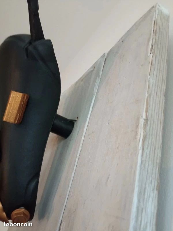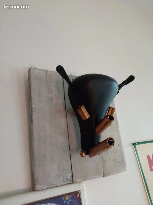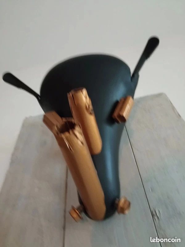 Vends Tête de rhinocéros fabriquée avec des pièces de vélo, noire et bronze fait main. Vendue avec le socle en bois. Etat excellent