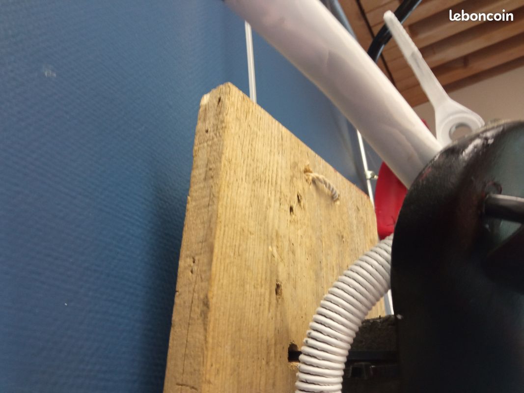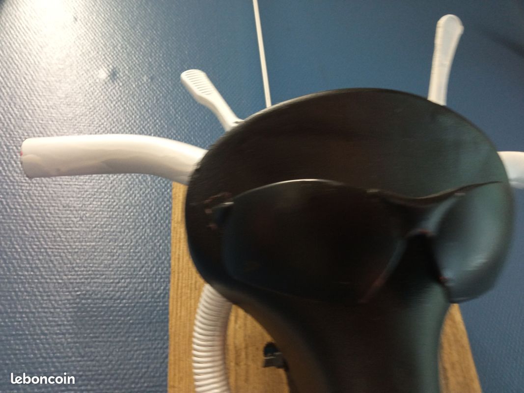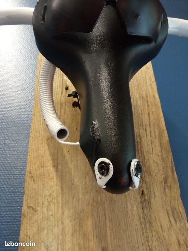 Vends Tête de taureau/vachette/bete a cornes en mode bodyguard fabriquée avec des pièces de vélo, noire et blanche. Vendue avec le socle en bois. Etat excellent.