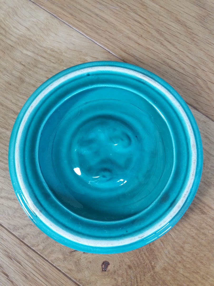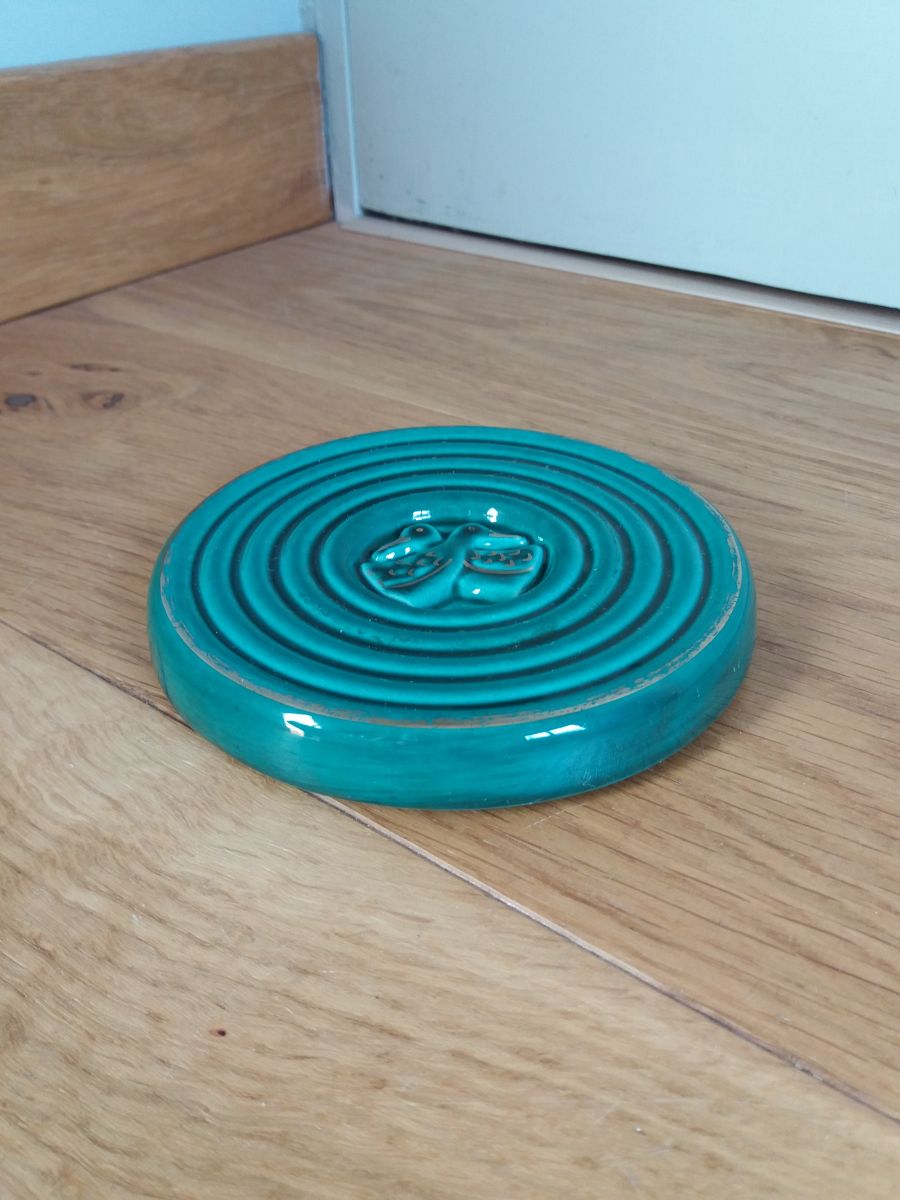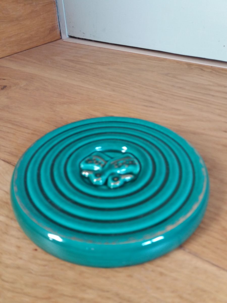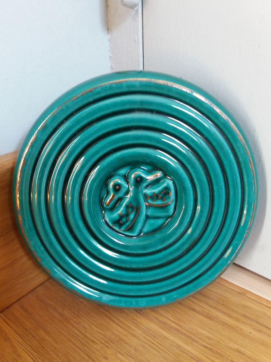 Joli dessous de bouteille qui pourra aussi faire office de dessous de plat pour les casseroles d’un diamètre pas trop grand. Il est en céramique émaillée vert émeraude (les photos ne rendent pas bien la couleur réelle, il n’est pas turquoise) avec un liseré doré sur le pourtour et rehaussant les détails des canards en relief au centre. Il proviendrait de la manufacture saint clément de Lunéville (pas d’estampille) et daterait des années 50. Il est en bon état général, ni fêle, ni egrenure mais le liseré doré circulaire est estompé par endroits. Il mesure 12 cm de diamètre et 1, 5 cm d’épaisseur.