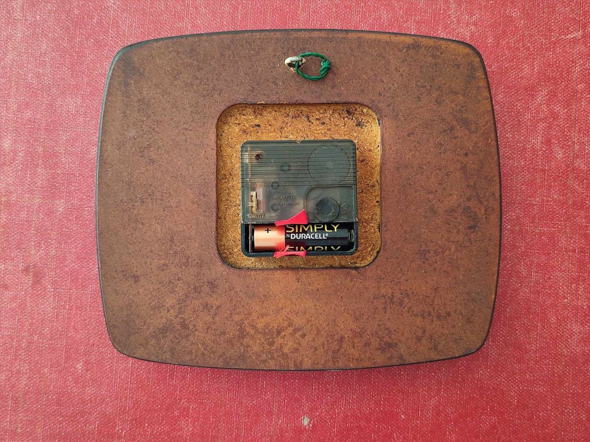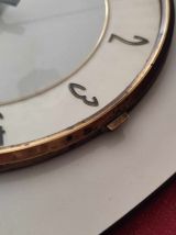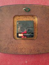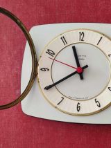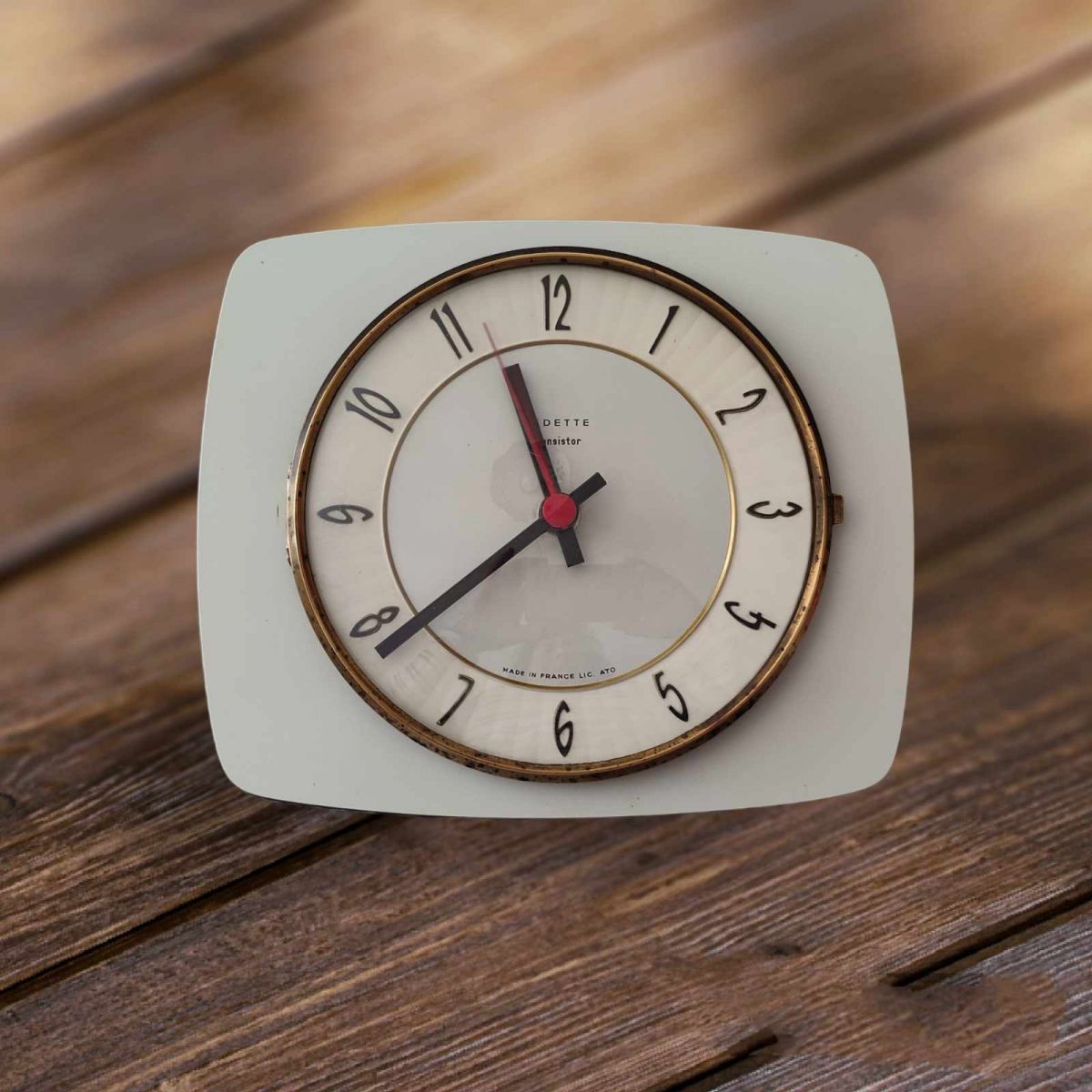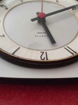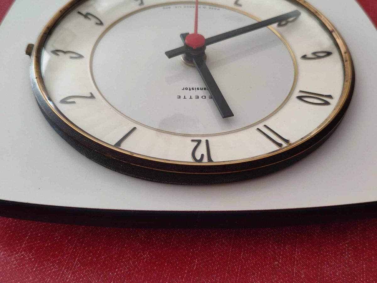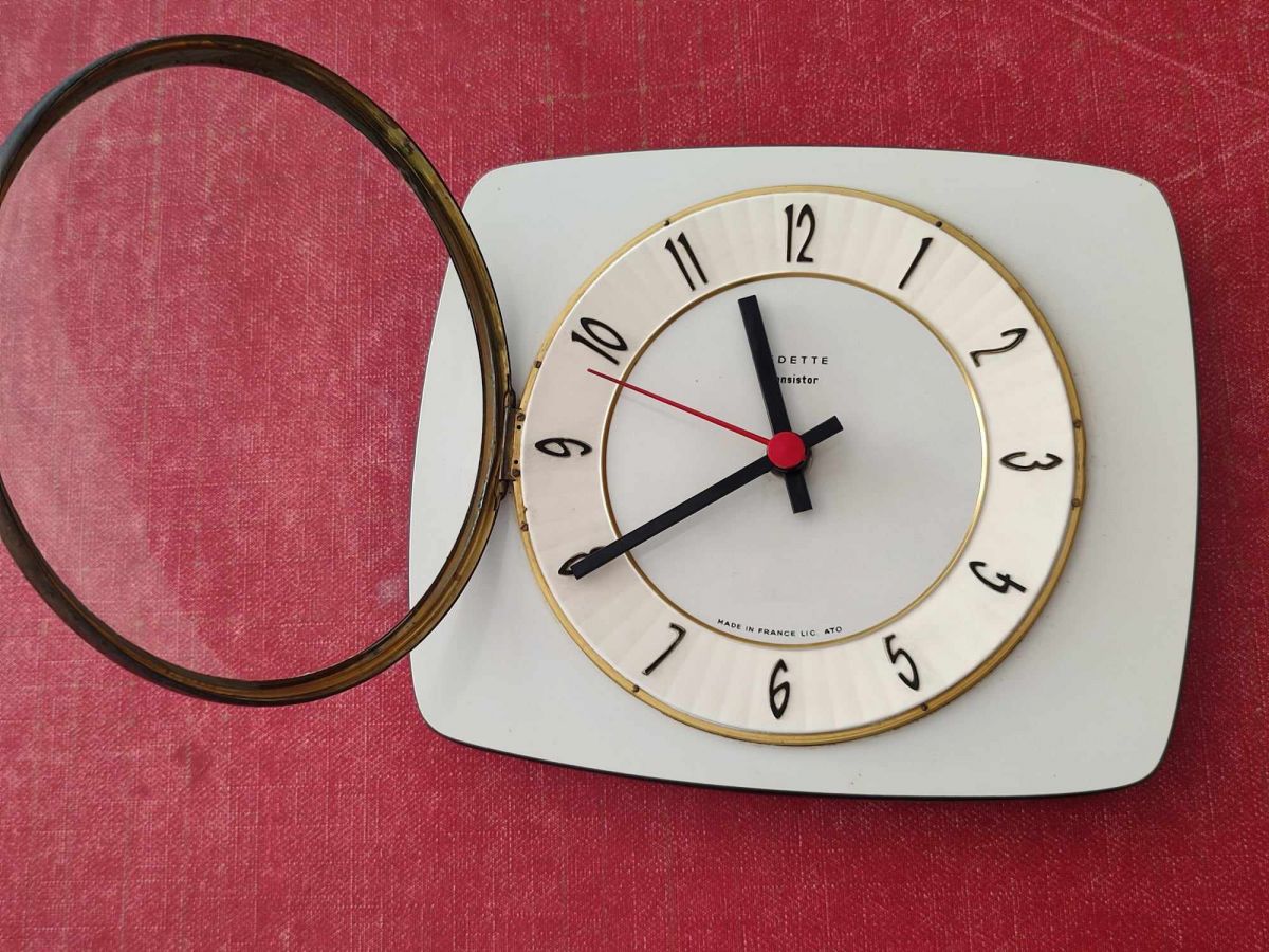 Pendule en formica Vedette Transistor en parfait état de fonctionnement. Le cadran, en laiton, s’ouvre.