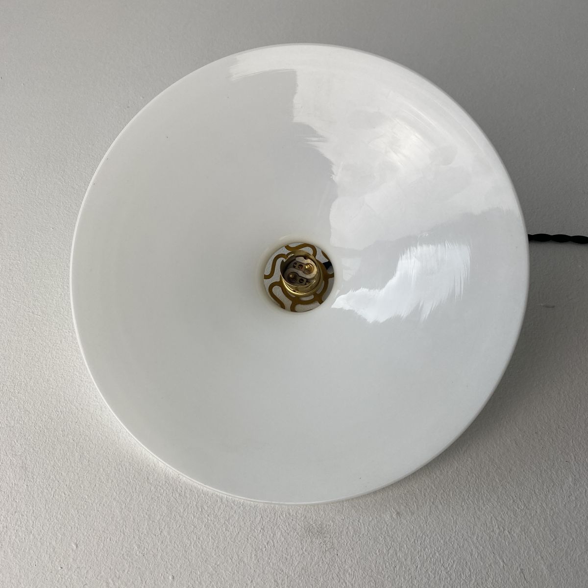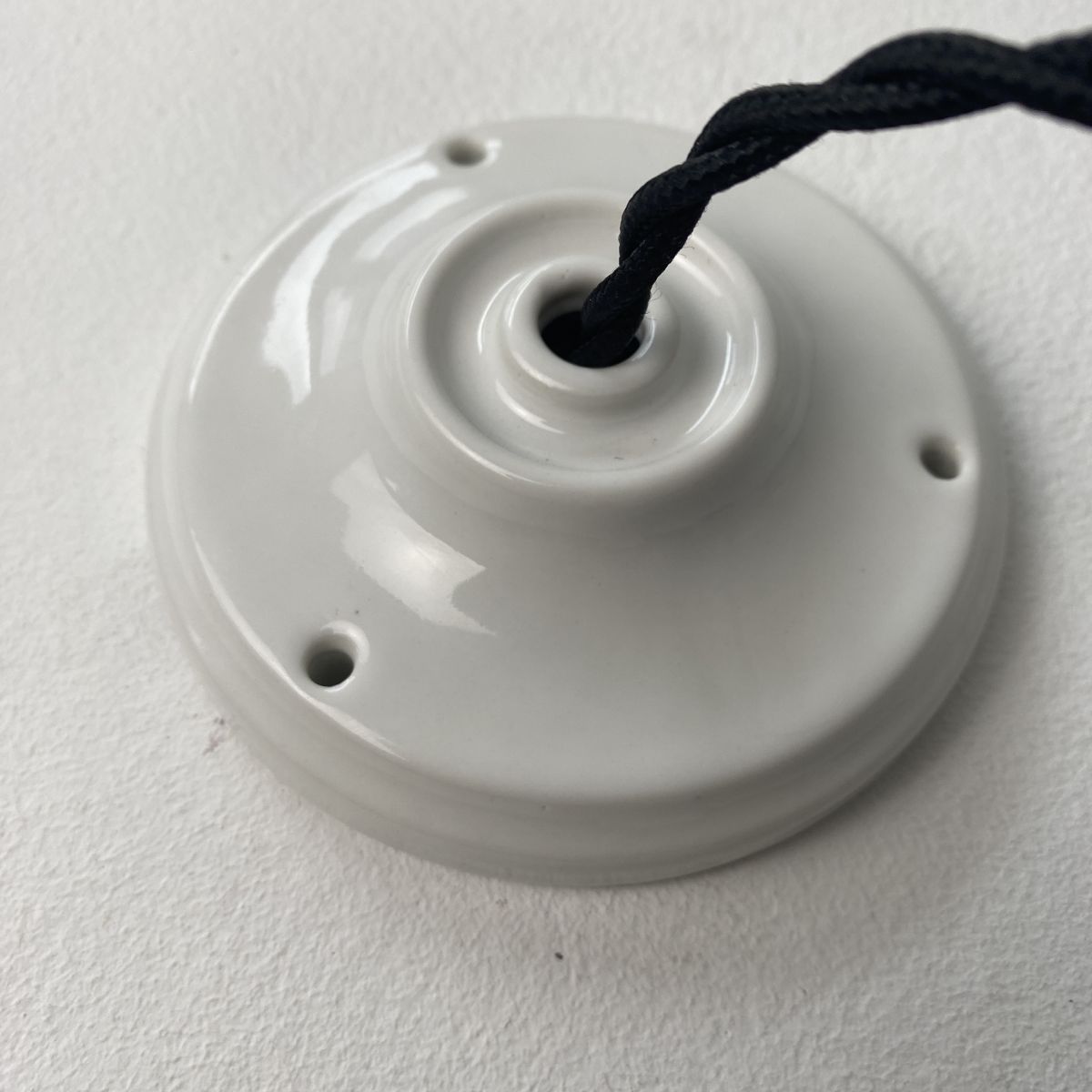 Electricité neuve avec fil noir en tissu torsadé. Prête à brancher par domino. Douille à baïonnette (ampoule B22) et rosace de fixation en porcelaine.