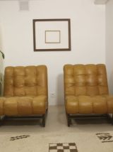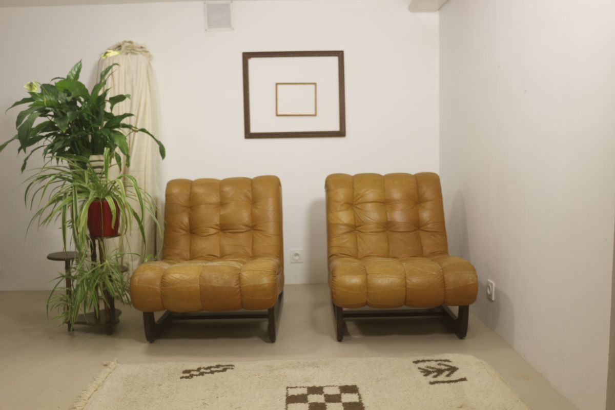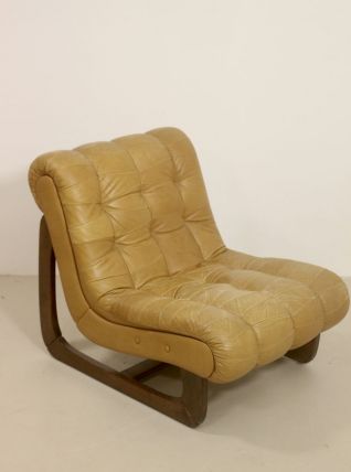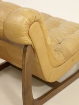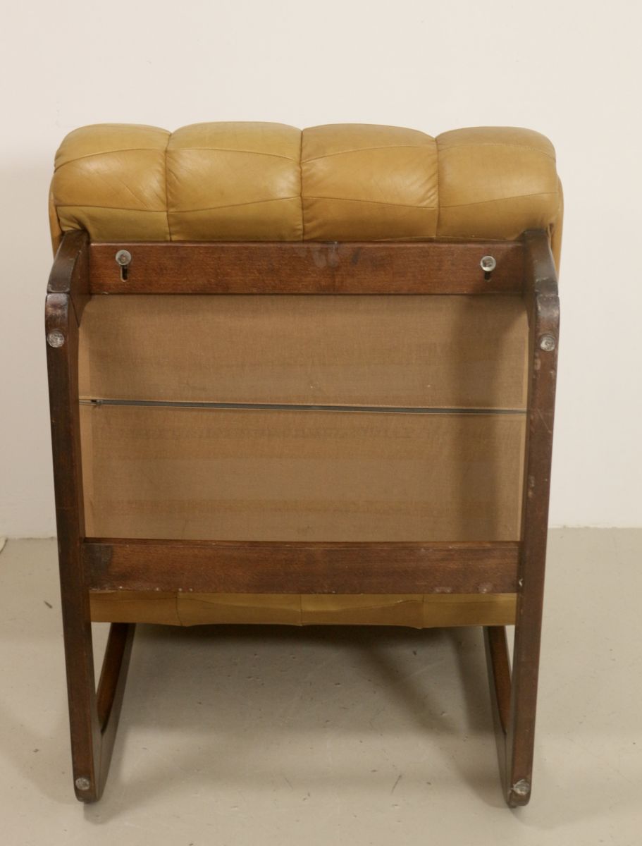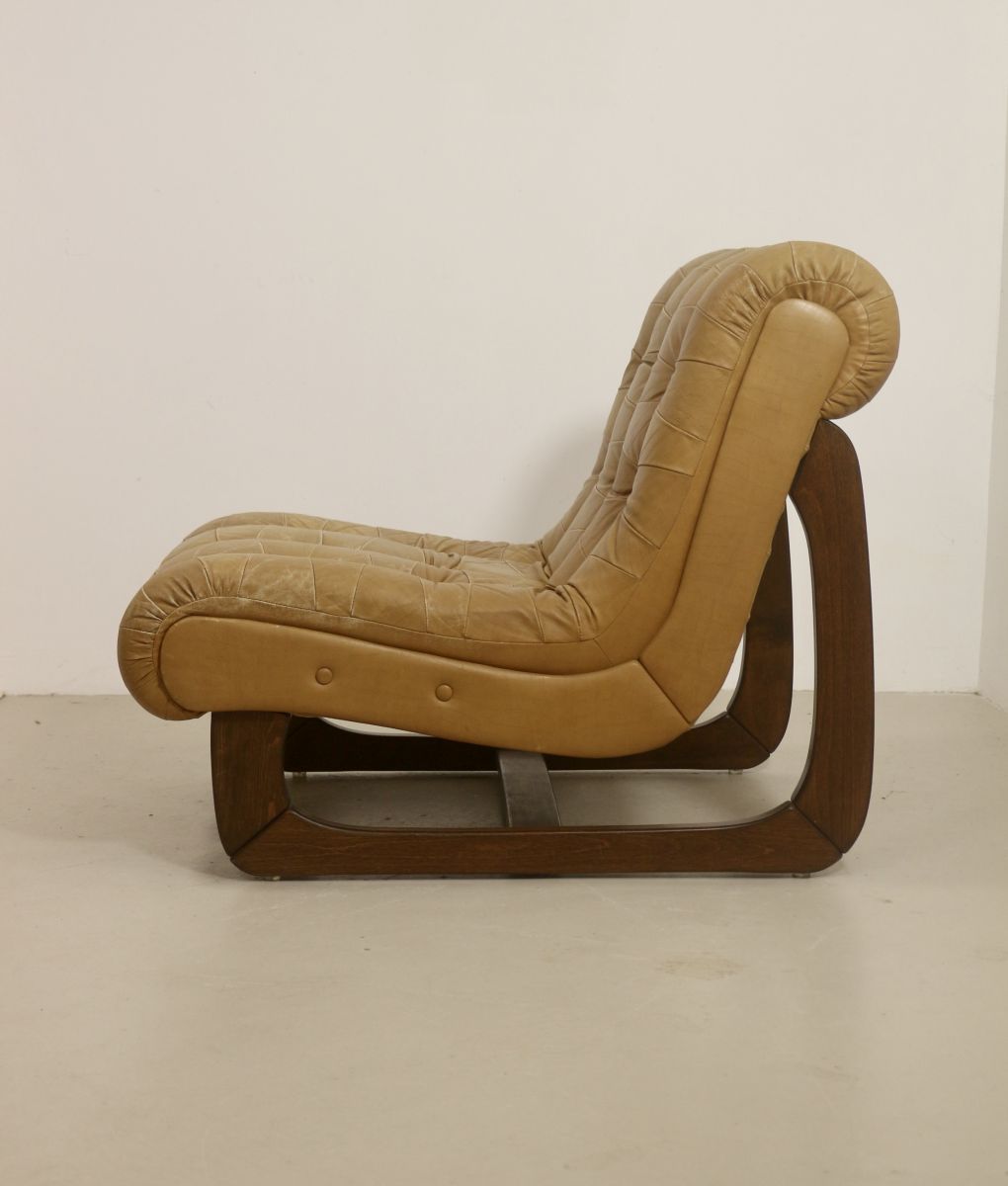 Fauteuil vintage année 60 de style scandinave fabriquée en Finlande dans les années 1960-1970. Fauteuil en cuir légèrement patiné par le temps, très bonne état de conservation. Bois massif. L’assise offre un grand confort par sa forme incurvée. Période de design 1960 à 1969.