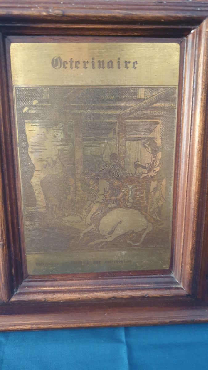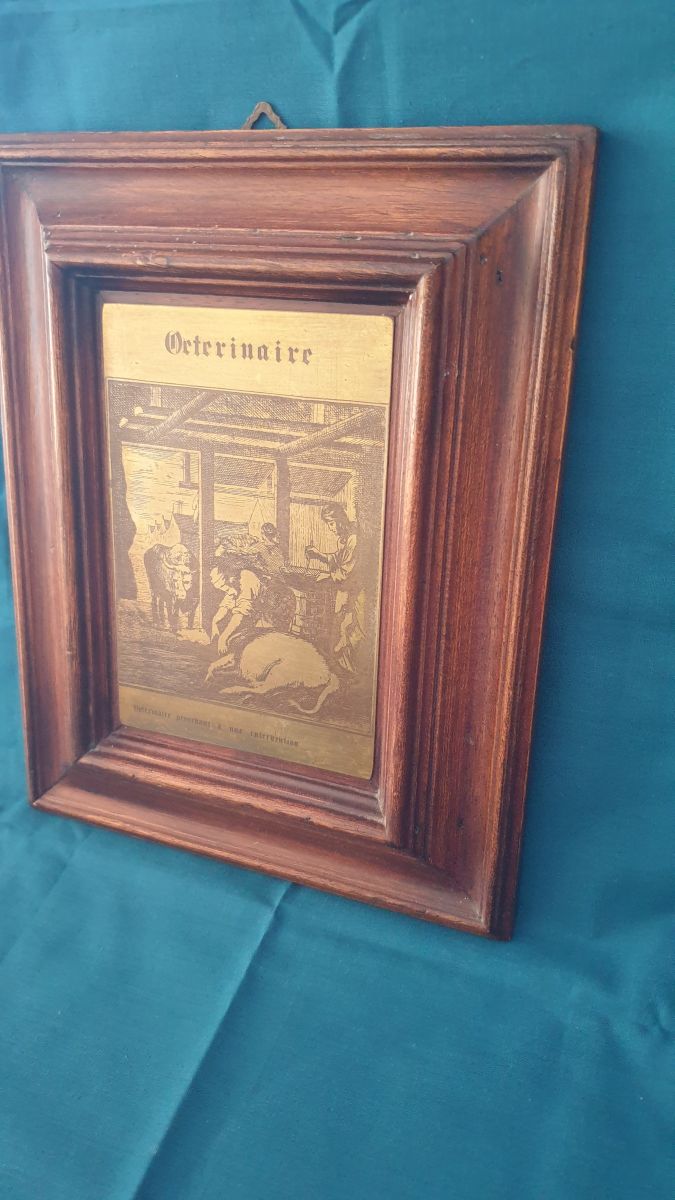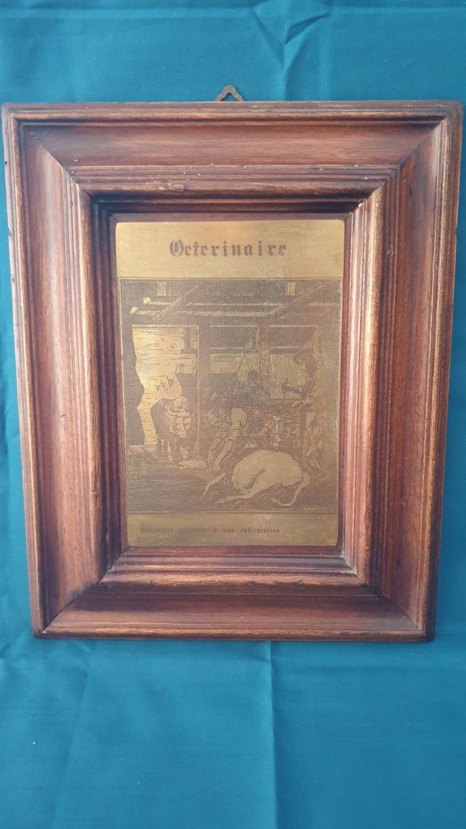 Plaque de cuivre gravée représentant le métier de vétérinaire . Encadrement d'origine en bois.