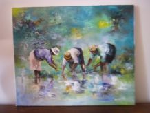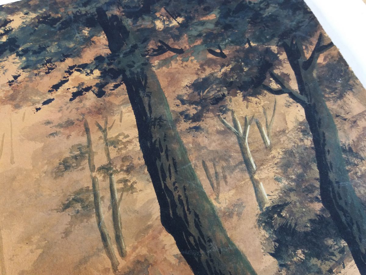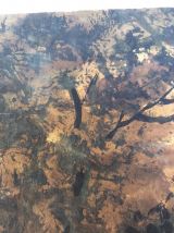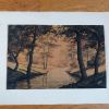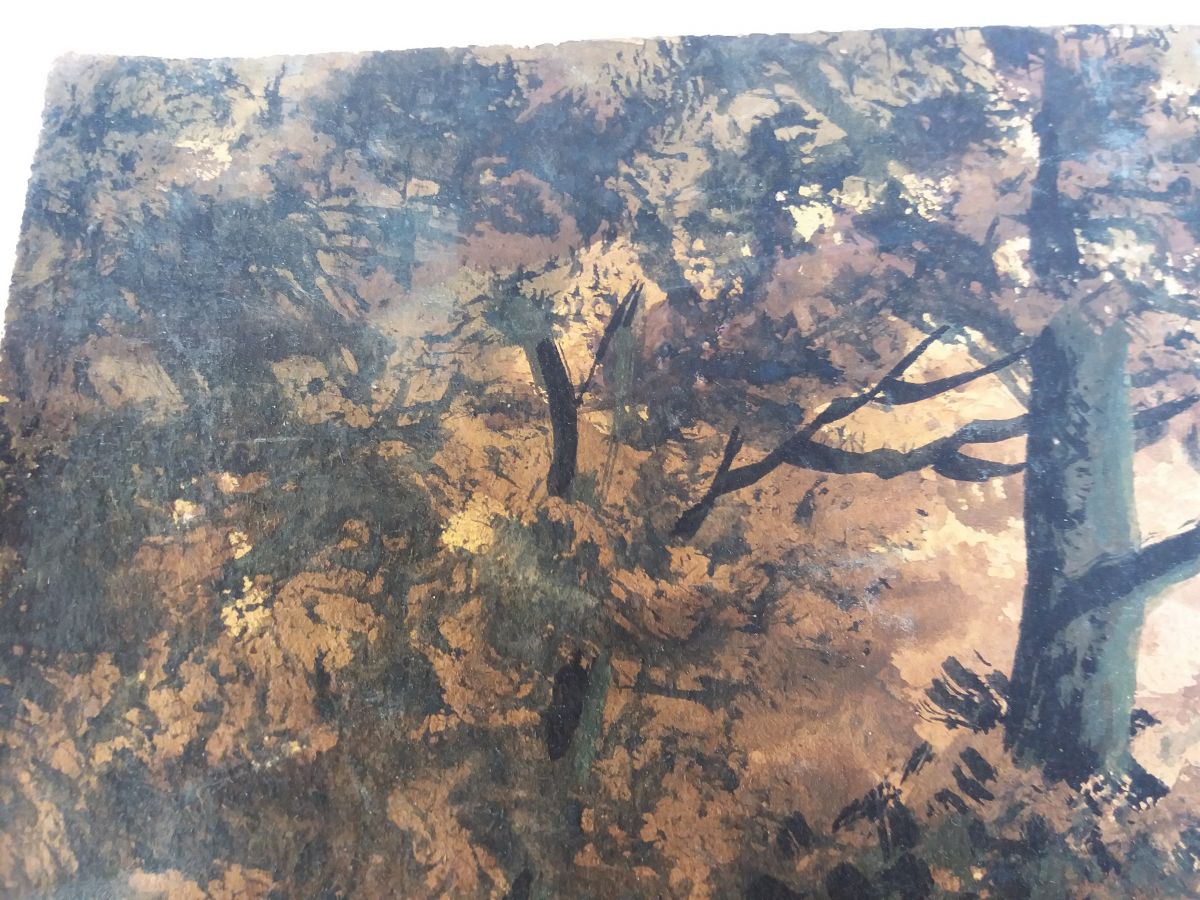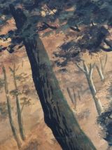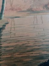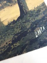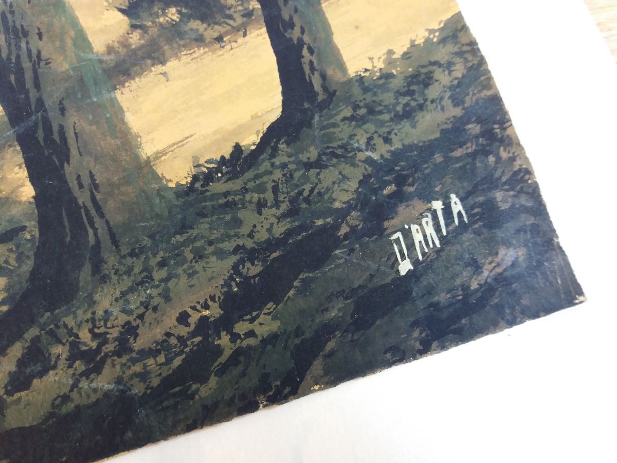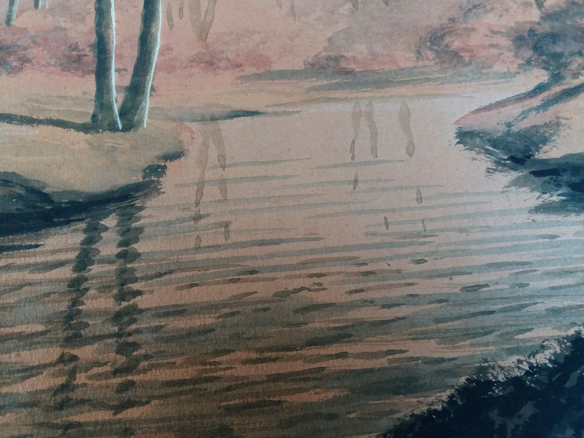 Très belle aquarelle sur papier épais (type canson) représentant un paysage forestier au bord d’une rivière peut-être au lever du jour ou à la tombée de la nuit, dans des tons noirs, marrons, orangés. Elle est signée Darta, je n’ai pas retrouvé d’informations sur l’artiste, si ce n’est qu’une autre œuvre de cet artiste est en vente chez un antiquaire parisien qui la date de la première moitié du 20ième siècle. Mais on remarque la qualité, la finesse du dessin, c’est un artiste qui mériterait d’être connu ! L’œuvre est fixée sur une feuille plus grande et plus fine par deux points de colle (probablement facilement détachable car d’un coté les points de colle ont lâché). Ce support est beaucoup plus clair autour que sous l’aquarelle (beige contre écru), probablement une décoloration due à l’exposition à la lumière naturelle, ce qui confirmerait plus ou moins la datation assez ancienne de l’autre œuvre signée par cet artiste. L’aquarelle est en plutôt bon état, pas de déchirure ou de marque de pliure, quelques taches plus claires, d’origine ou non, difficile à dire, et quelques « traits » plus clairs, très légèrement visibles de près sur les parties foncés comme les troncs. L’aquarelle mesure 42 cm par 27, 5 cm, le papier de support mesure 50 cm par 40 cm. L’ensemble sera expédié à plat, protégé le mieux possible de l’humidité par un emballage plastifié.