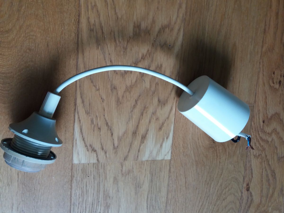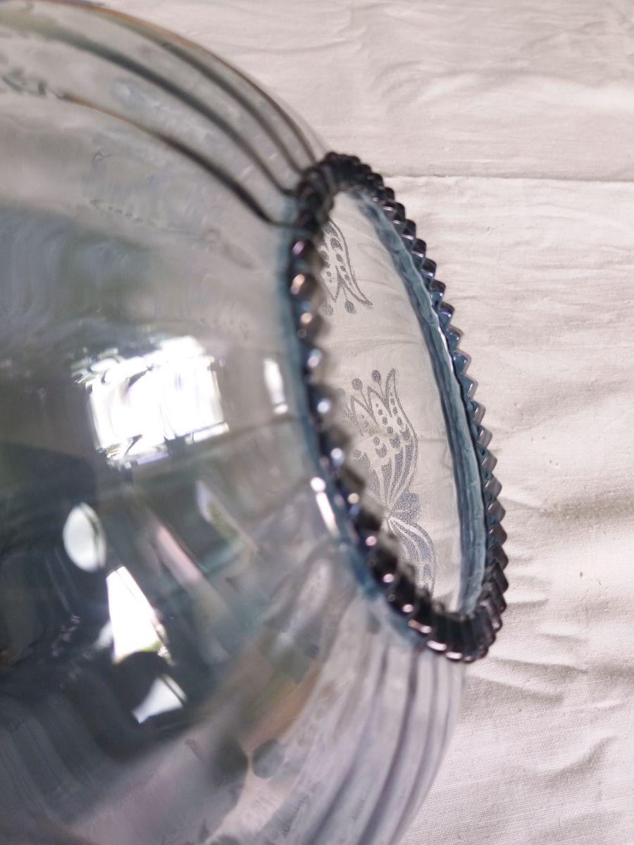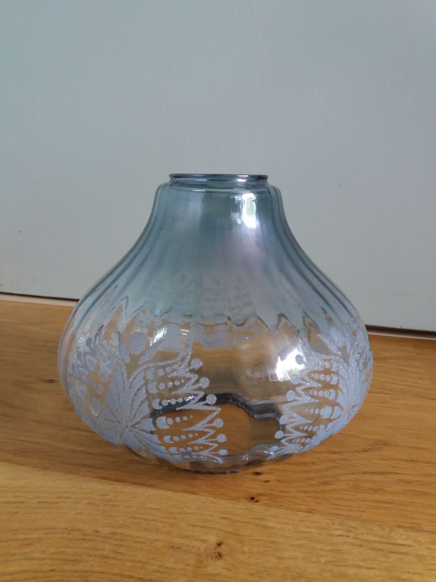 Charmante suspension avec une jolie forme de figue, légèrement côtelée et terminée par un rebord crénelé, en verre bleuté transparent décoré de motifs floraux en léger relief, à l’aspect finement granuleux. Elle date des années 60 ou 70. Elle est en très bon état pour son âge, ni fêle, ni éclat, les motifs sont intacts. Le système électrique est complet ( douille pour ampoule à gros culot e27, anneau à visser pour maintenir l’abat jour en place, câblage, anneau de suspension et cache-piton) et fonctionne, je l’ai testé, mais il ne cache pas son âge : jaunissement des parties en plastique (cache-piton notamment), brunissement sur le filetage de la douille et sur l’anneau à visser mais ce n’est pas trop problématique car c’est dans la tulipe. La tulipe en verre mesure 16 cm de diamètre maximal, 15 cm de hauteur, le câble mesure environ 30 cm de longueur.