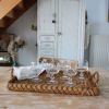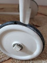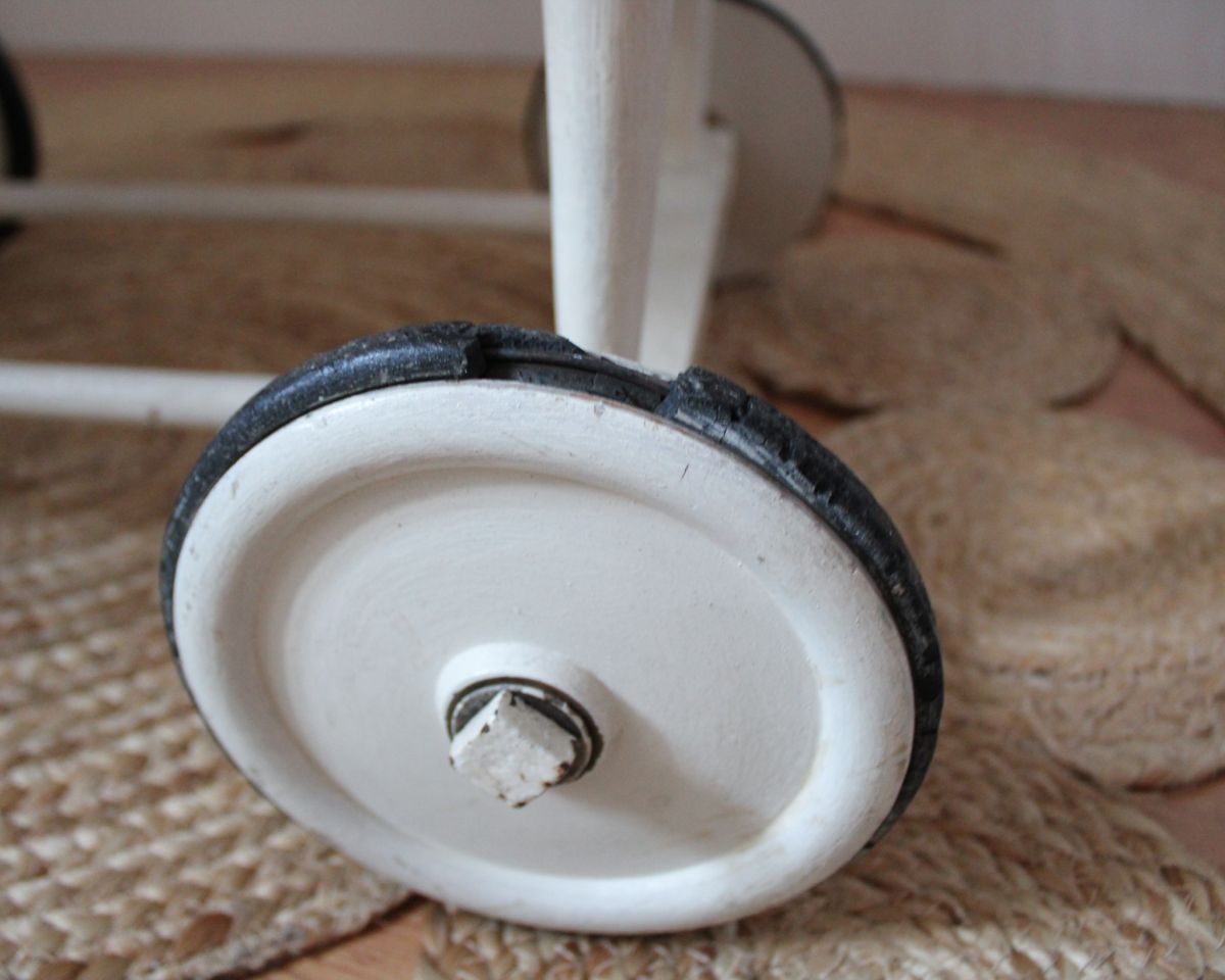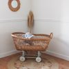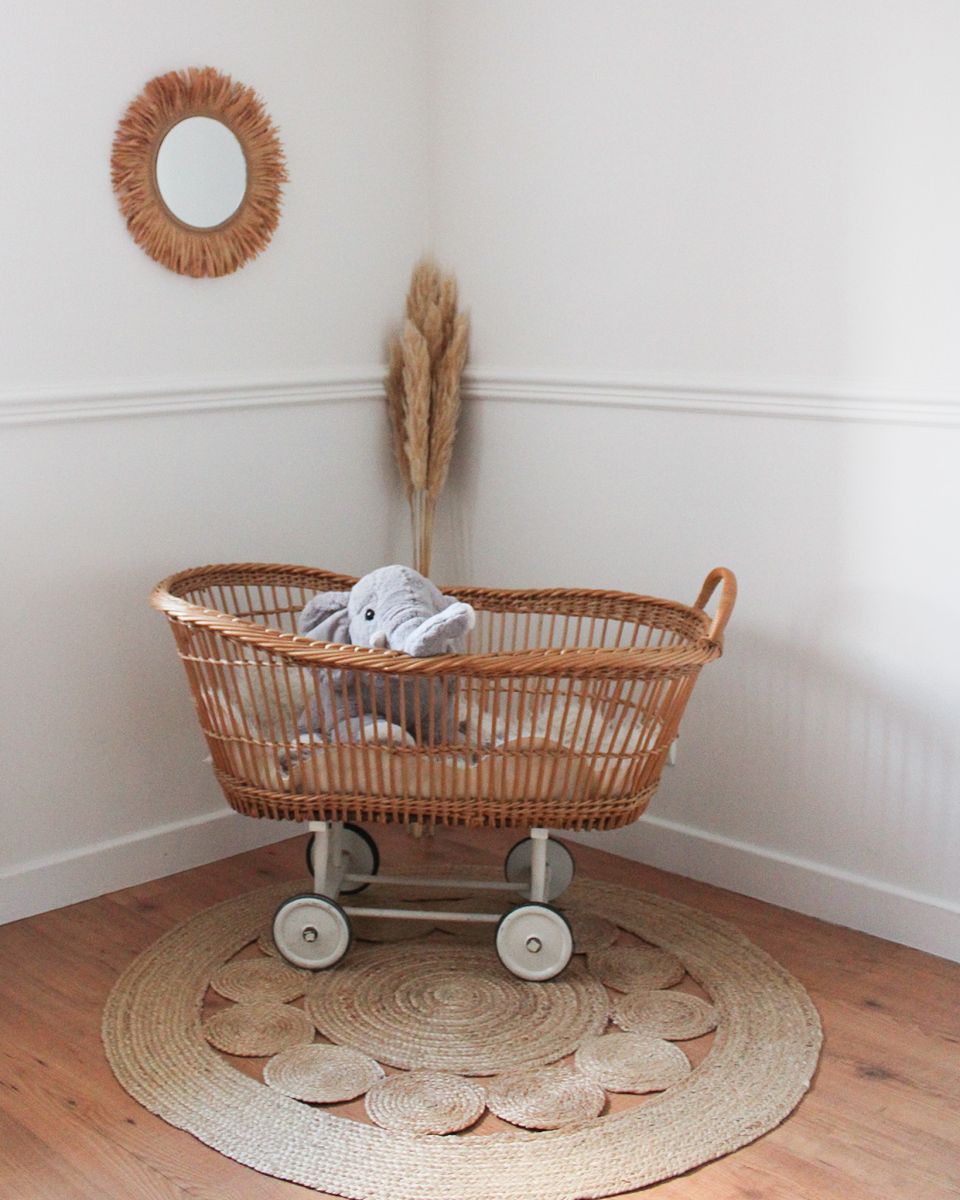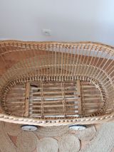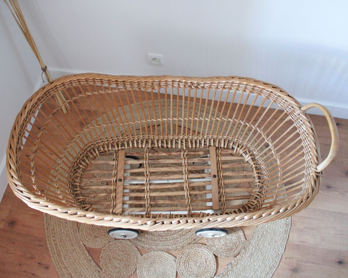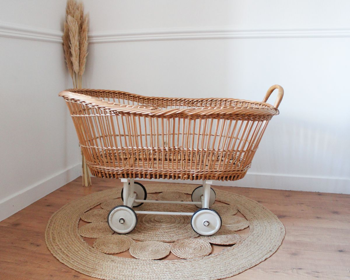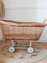 Très beau berceau vintage en rotin, fixé sur un support en bois à roulettes. Le couffin est amovible (il est fixé sur le support à roulettes grâce à 2 vis) et est en très bon état. A noter que le caoutchouc qui entoure les roulettes est abîmé. L'ensemble reste toutefois solide et stable. Beaucoup de charme pour cet objet ancien, qui peut encore être utilisé ! Vendu sans matelas.