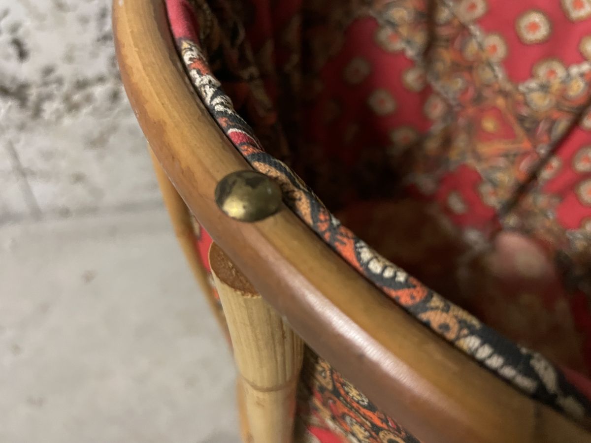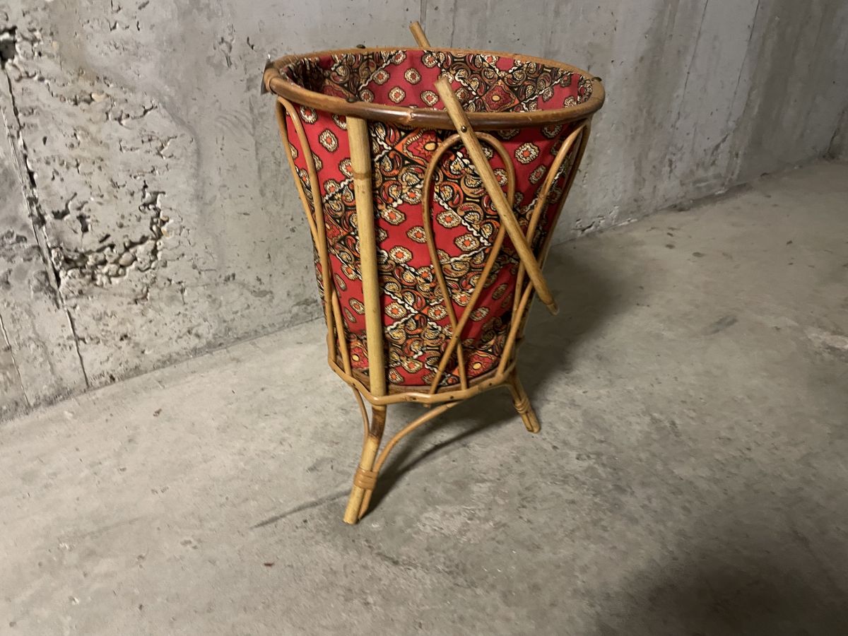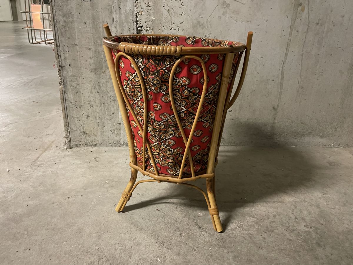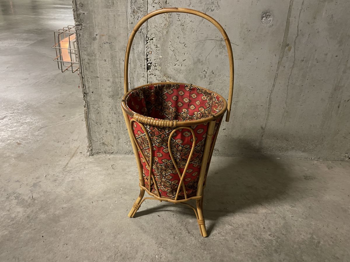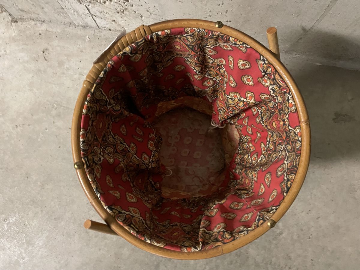 Petite travailleuse en rotin des années 60, pieds tripodes, tissu avec motif cachemire rouge, anse, hauteur 42cm, diamètre 30cm, aucun manque, très bon état.