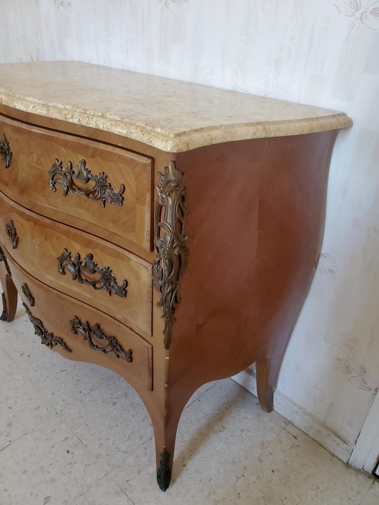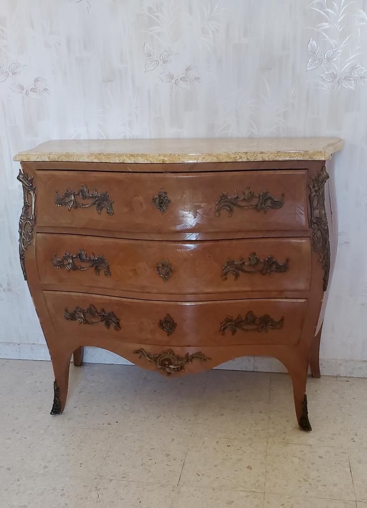 Jolie commode galbée, 3 tiroirs en bois de rose, dessus marbre rosé, ornements bronze