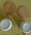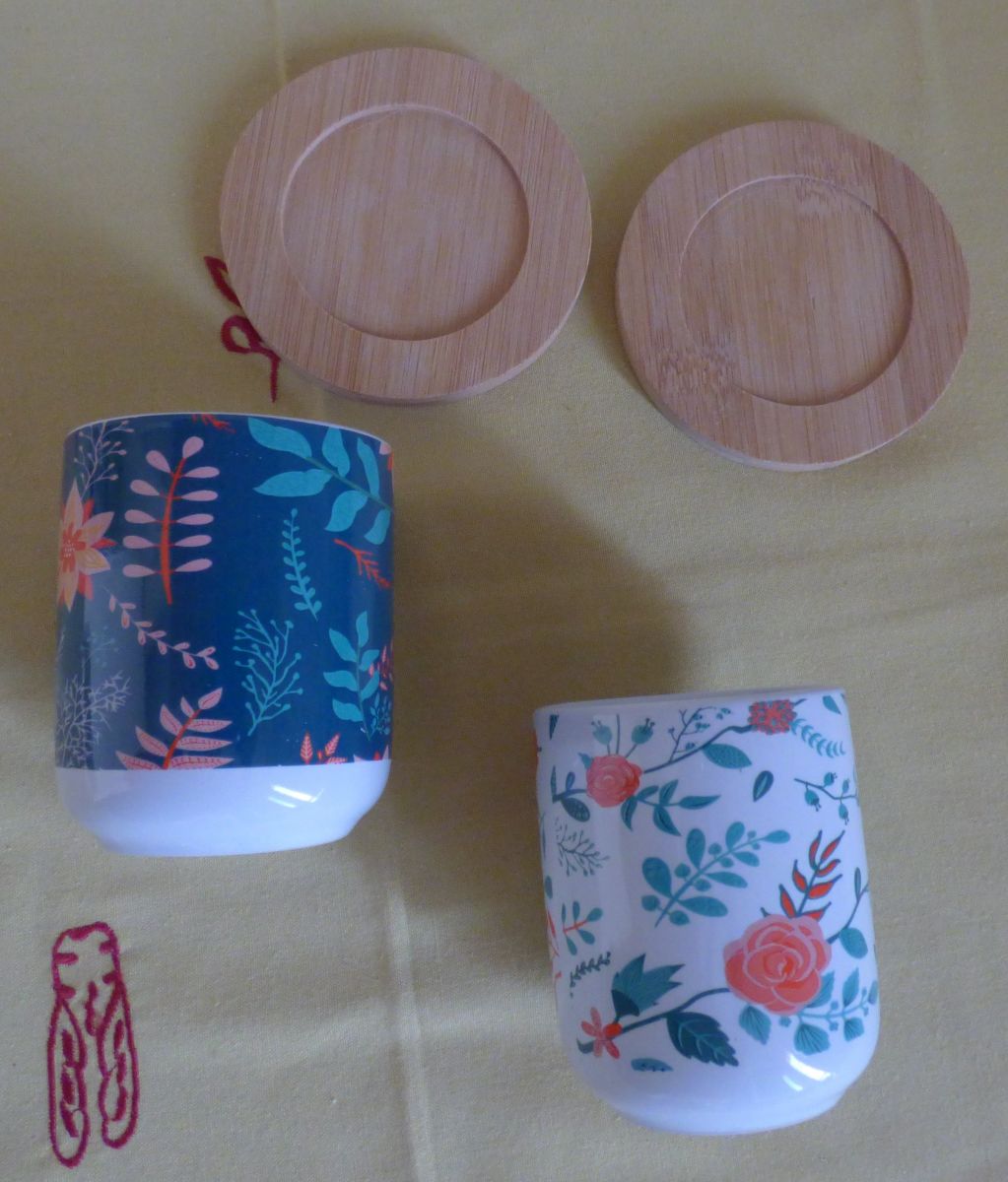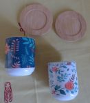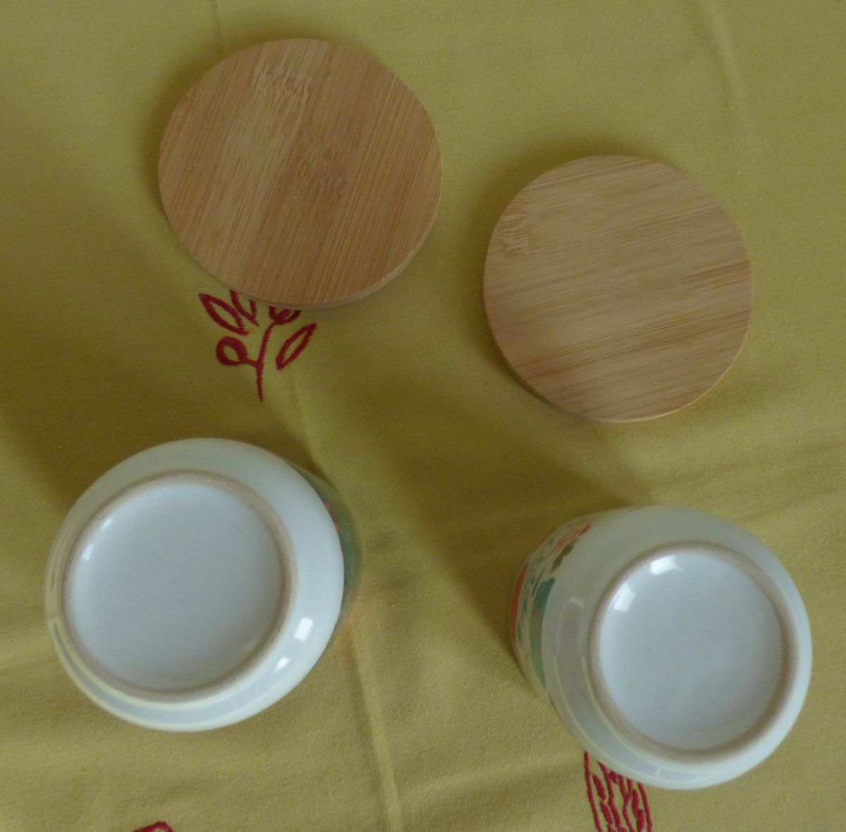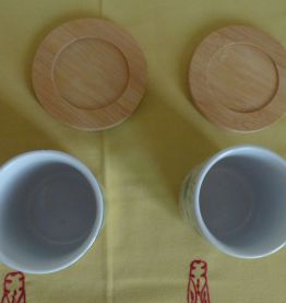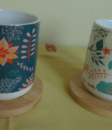 UN LOT DE DEUX MUGS AVEC LEUR SUPPORT EN BAMBOU POUR LE THE OU LE CAFE
