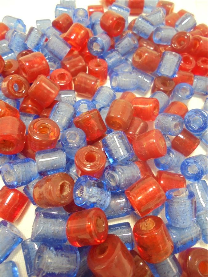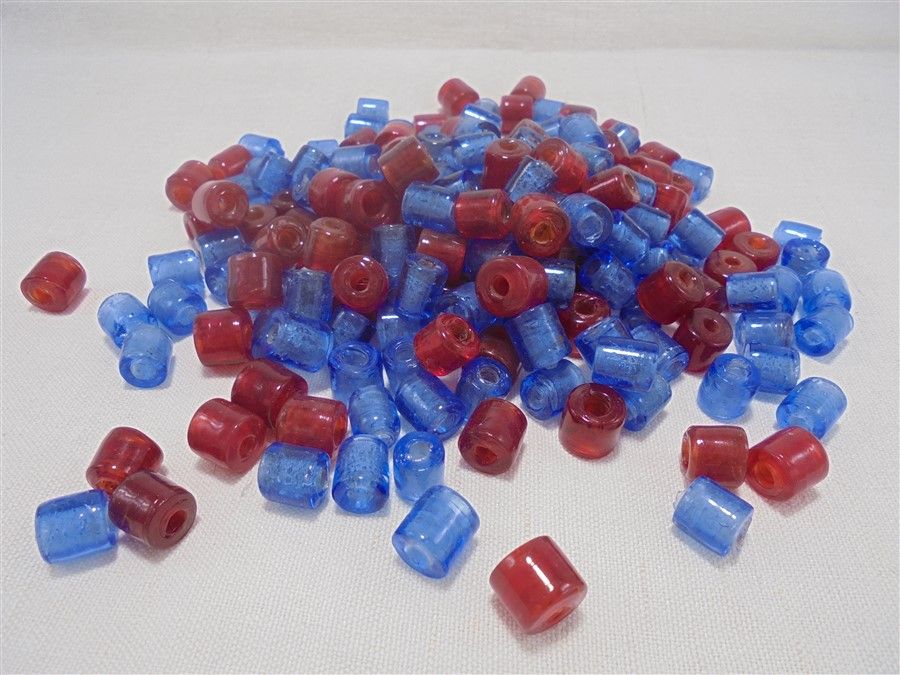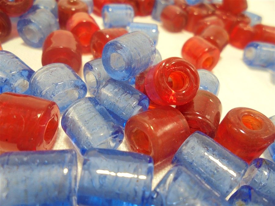 Perles en verre de forme cylindrique, de couleur rouge ou bleu translucide.