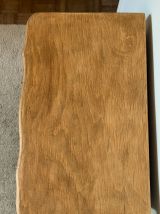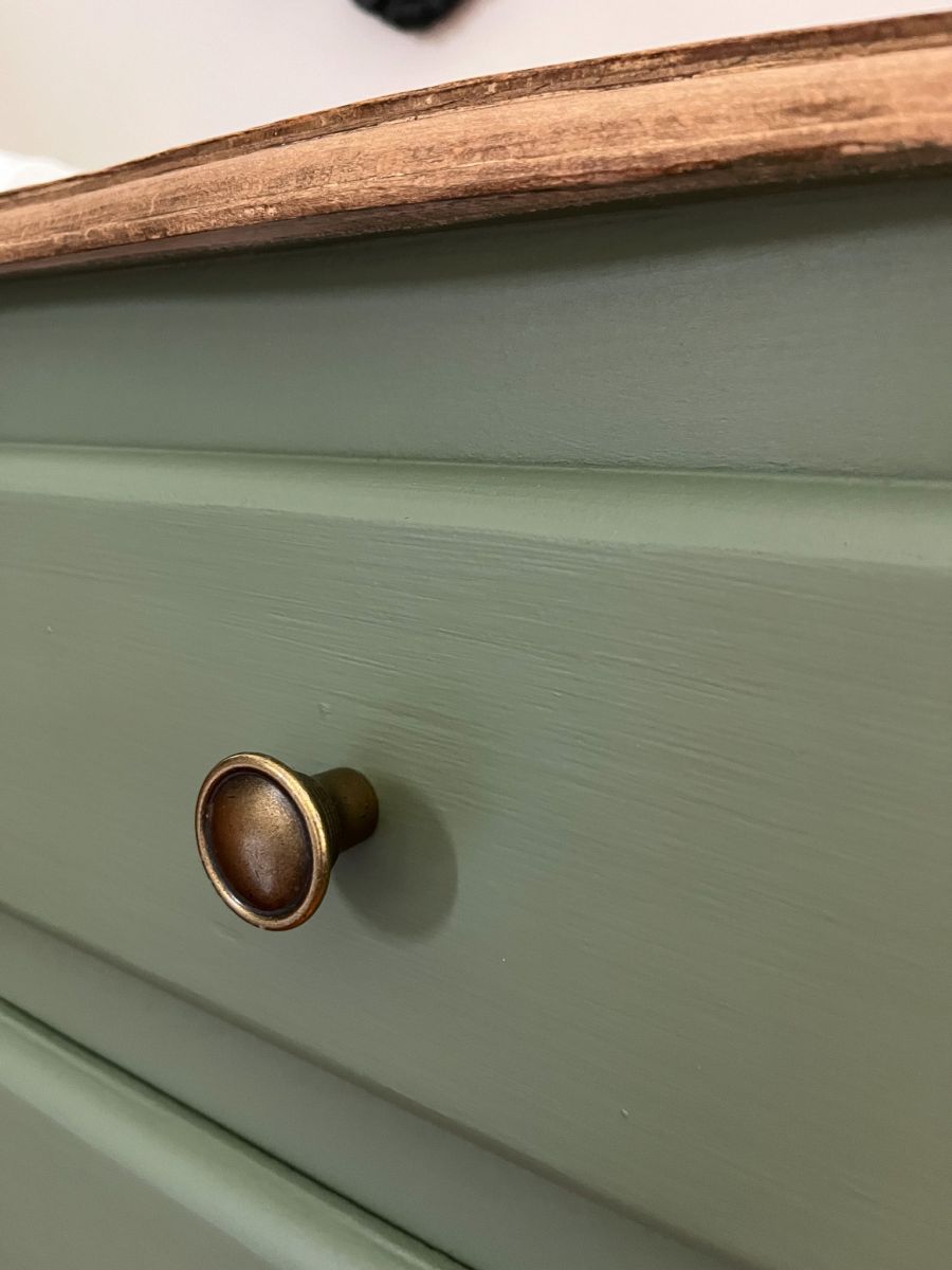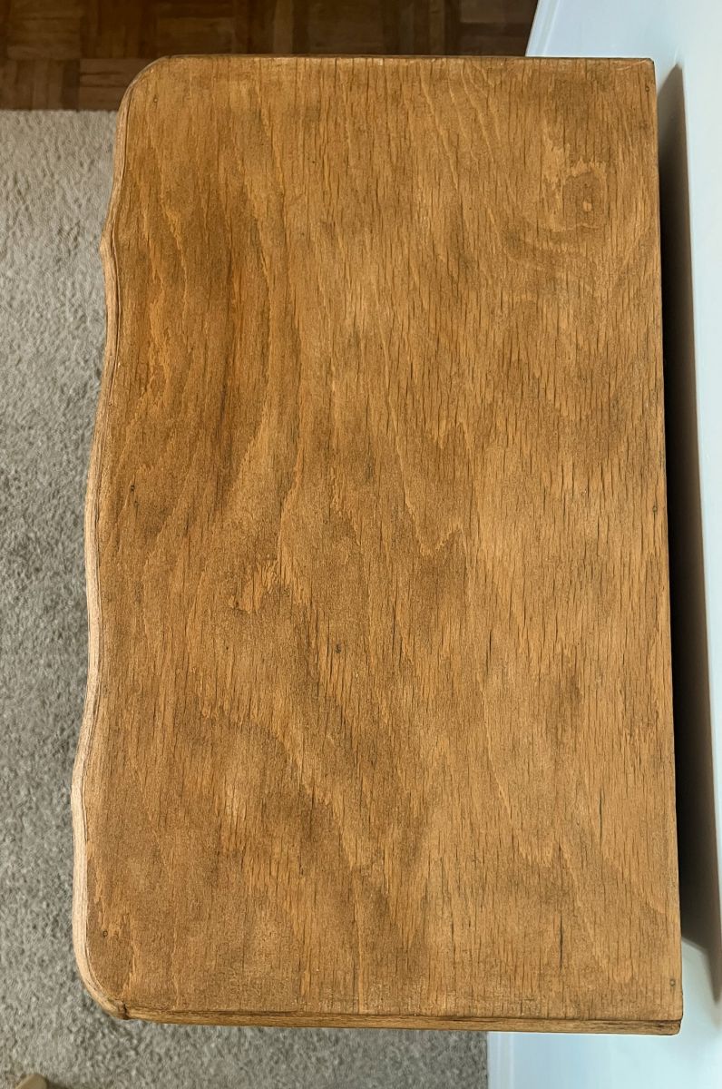 Plateau en bois brut ciré et corps vert treillis de chez Liberon.