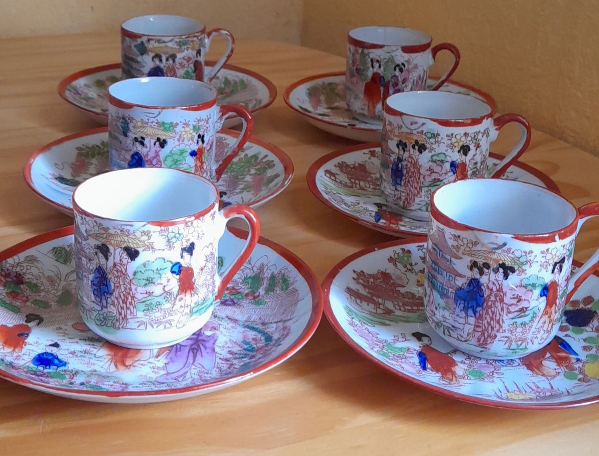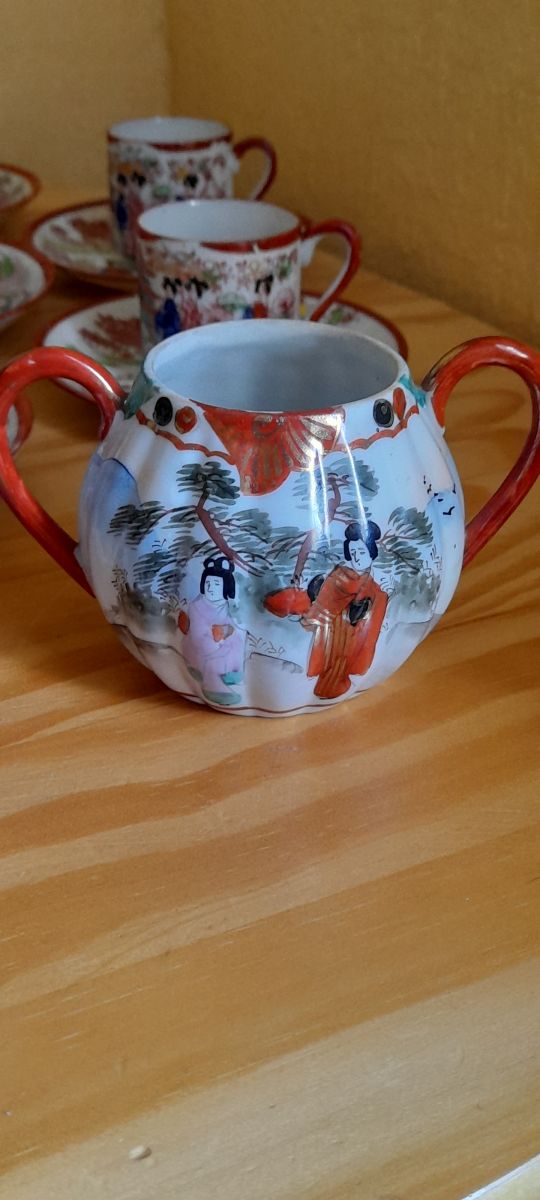Superbe service a thé japonais, comprenant 6 tasses et sous tasses, une theiere et un sucrier sans couvercle