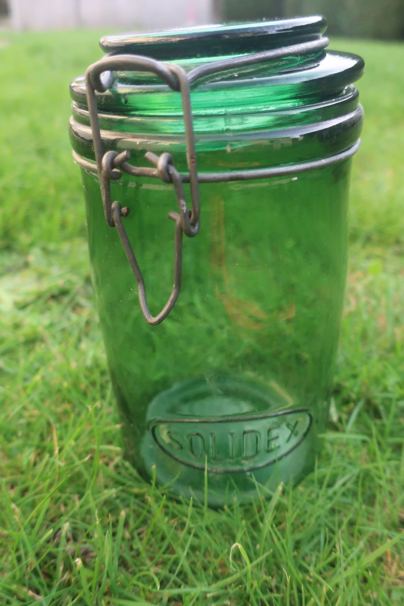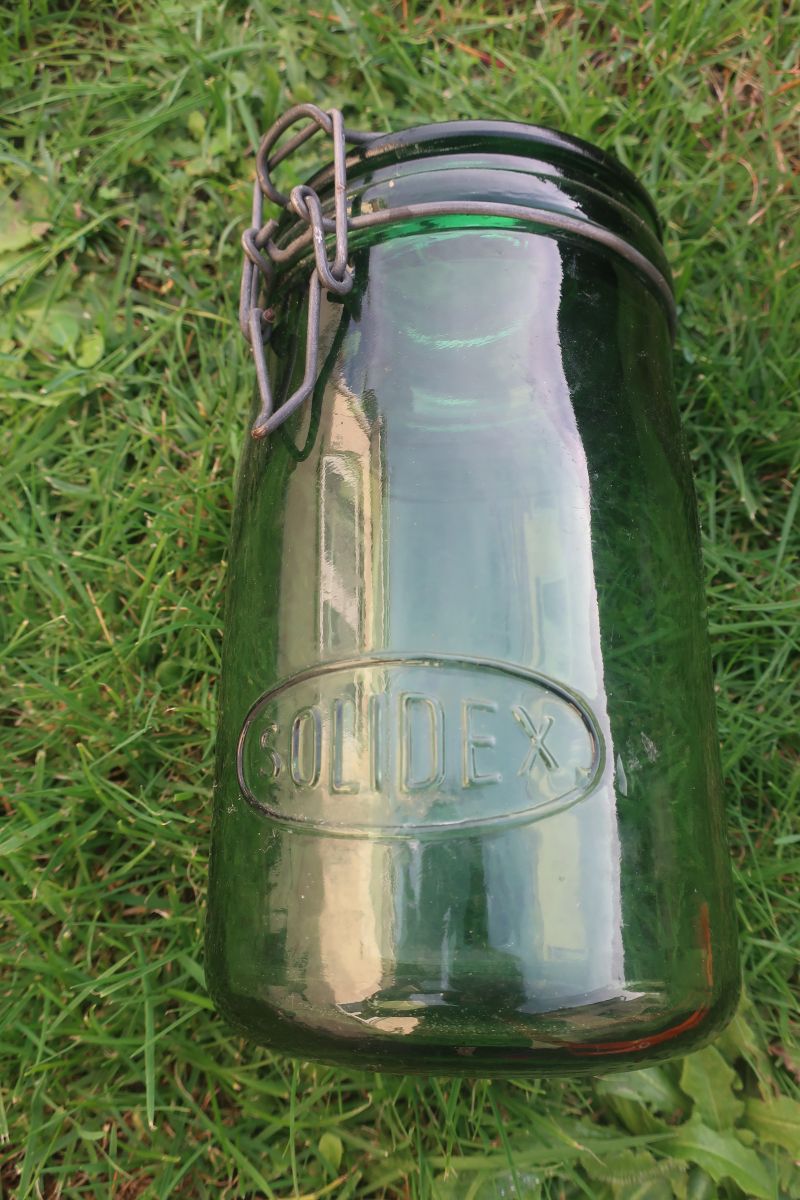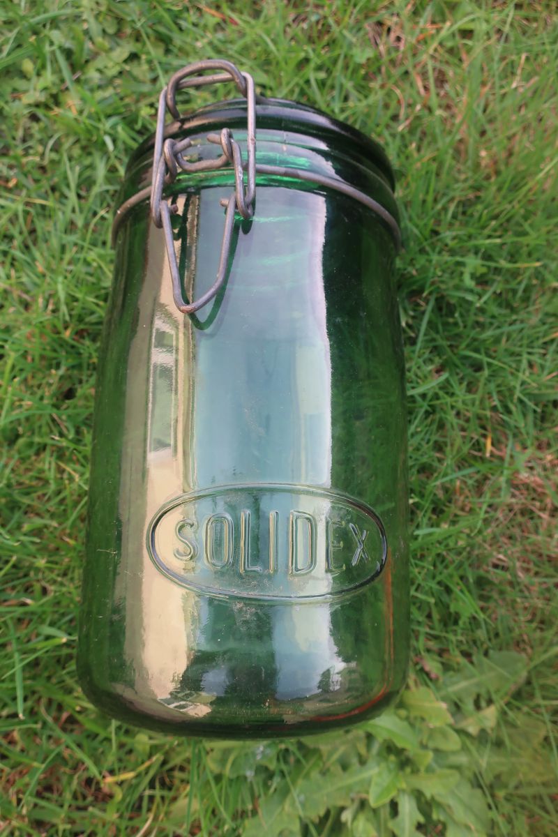 Ancien bocal en verre épais vert, Solidex, en très bon état.