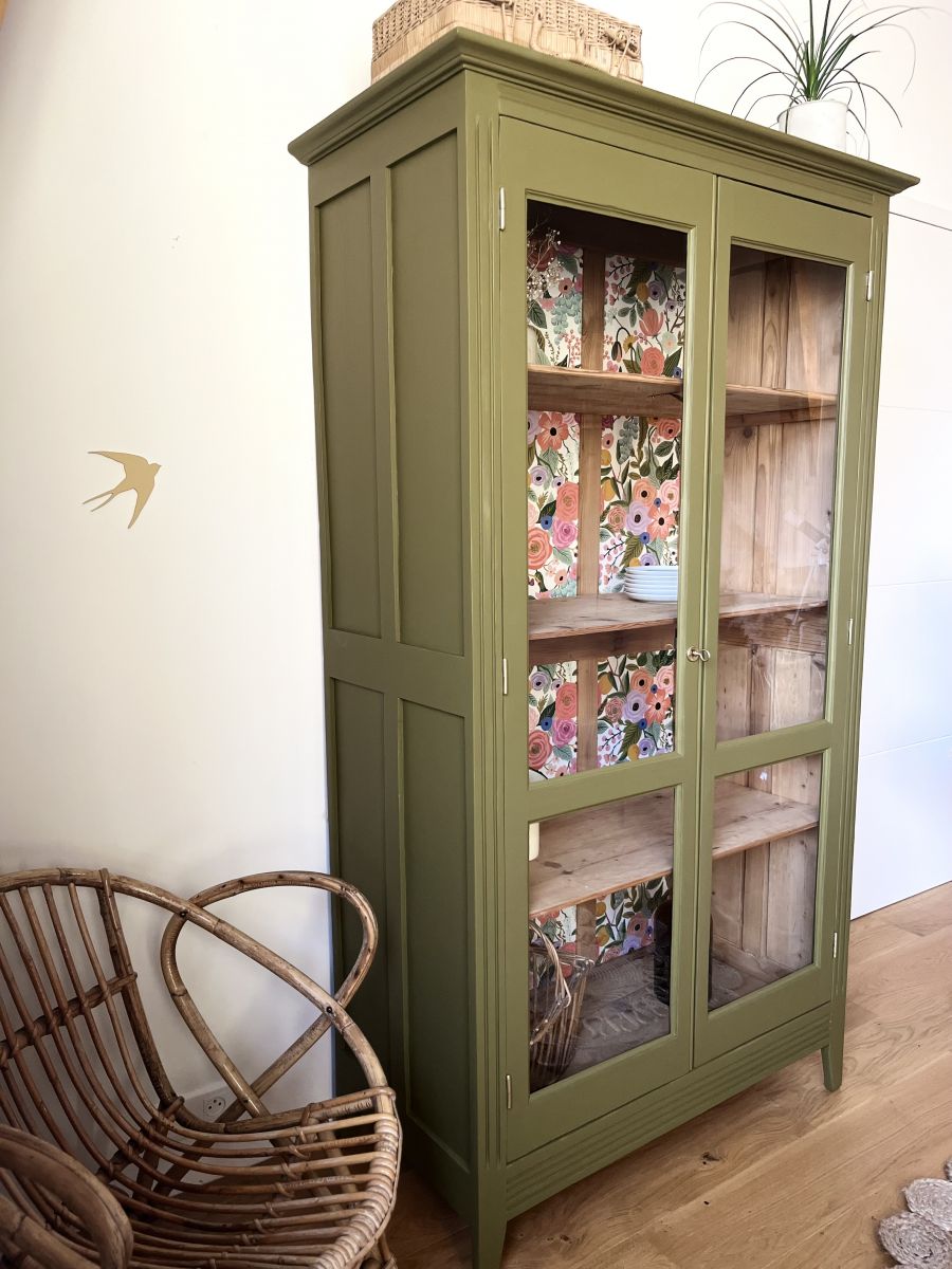 vitrine bibliothèque parisienne entièrement rénovée et revisitée. Sa couleur vert olive a été choisie pour s’accorder avec le papier peint haut de gamme garden party qui tapisse l’intérieur en bois brut. La serrure est neuve.