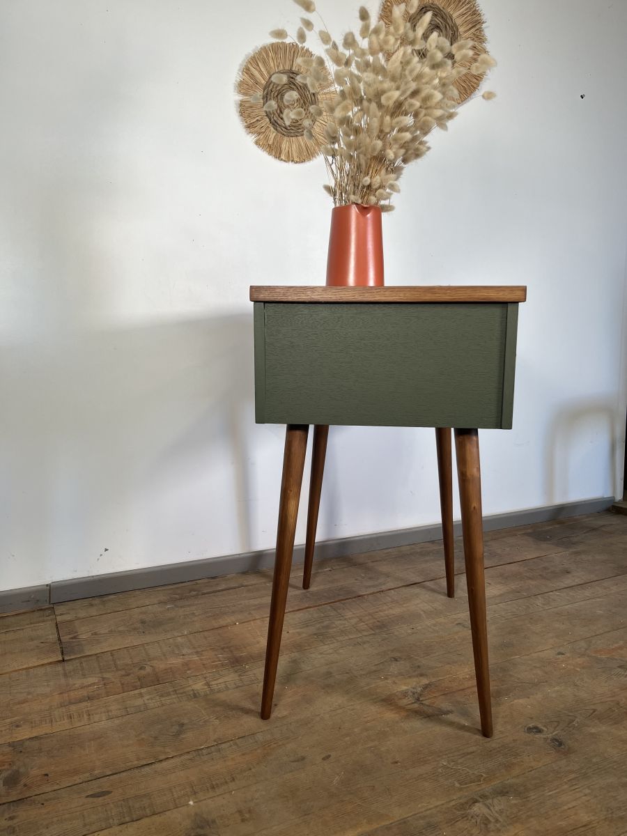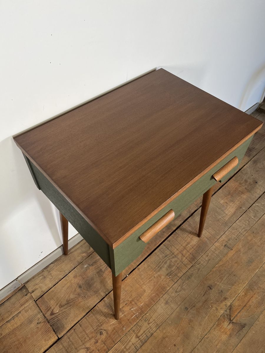 Ancienne table de machine à coudre revisitée. Le plateau a été fait sur mesure en plaqué chêne puis teinté. Structure repeinte en vert smoke.