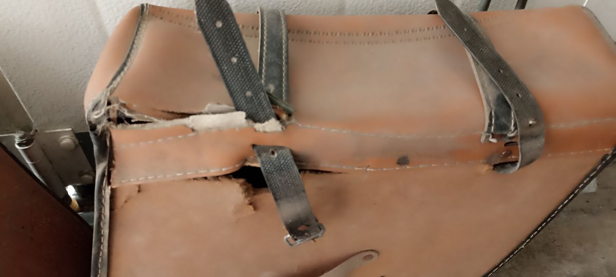 Marron, état moyen, attache et certaines coutures sont abimées.