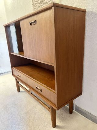 En placage de teck. Vitrine, deux tiroirs, une large niche ouverte et un espace type secrétaire. Très bon état, stable et propre.