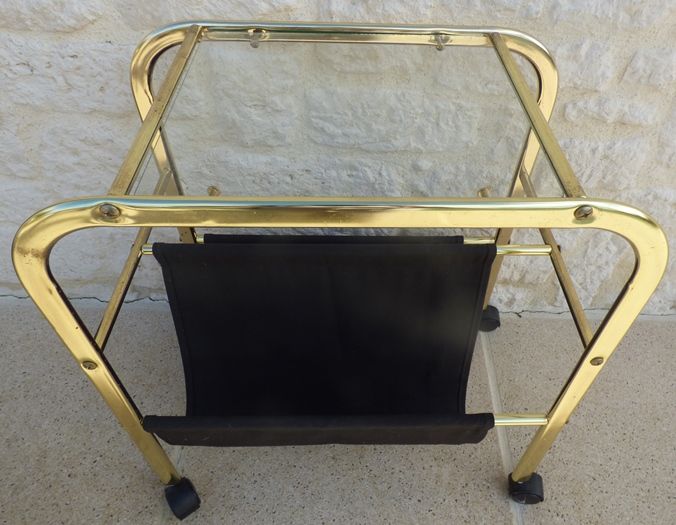 M20230201/Porte revue vintage en métal doré avec plateau en verre et deux compartiments de rangement en tissus noir – Dimension : hauteur totale : 56 cm – largeur totale : 51 cm –profondeur totale : 30 cm –dimension plateau en verre : largeur : 30.50 cm – profondeur : 27 cm