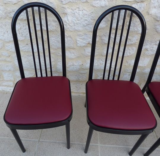 *M20230315/Lot de 4 chaises métal avec assises en simili cuir bordeaux de marque SOUVIGNET- Totalement restaurés- Dimension : hauteur totale : 94.50 cm-hauteur dossier : 53 cm – Dimension assise : largeur : 41 cm – profondeur : 43.50 cm – hauteur : 46 cm