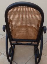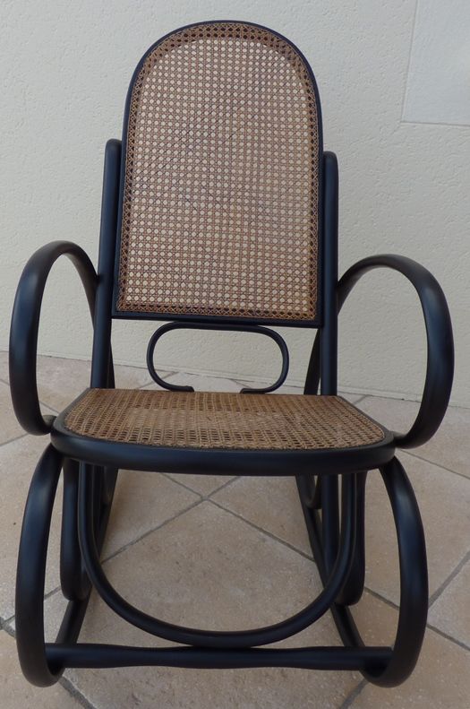 *M20230329/Rocking-chair fauteuil canné à bascule de couleur noir – totalement relooké – Dimension : longueur empattement : 100 cm –largeur totale : 53 cm - hauteur totale : 97.50 cm Dimension assise : largeur : 48 cm –profondeur : 47.50cm-hauteur assise : 48 cm – hauteur accoudoir : 63 cm – hauteur dossier : 74 cm
