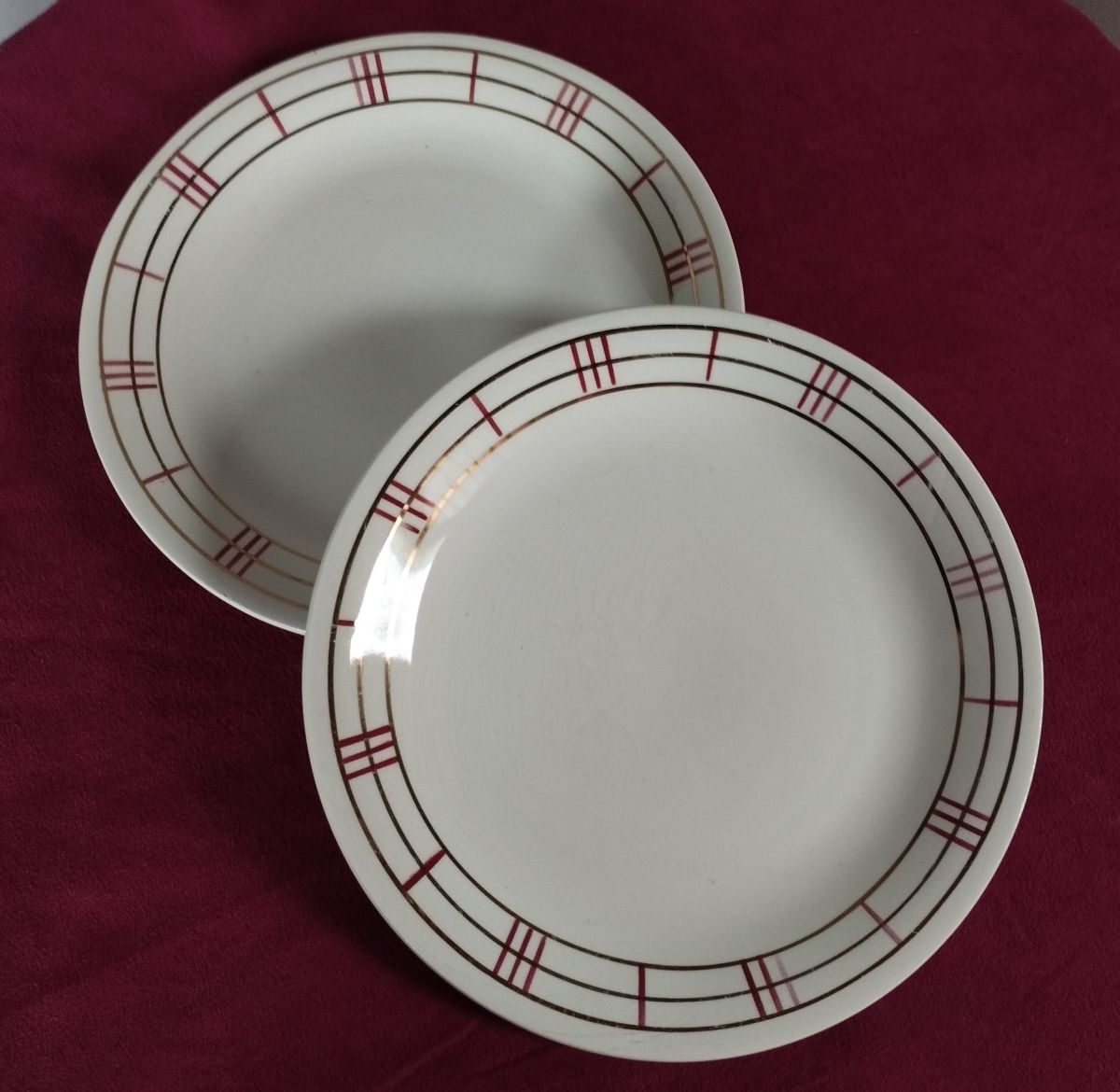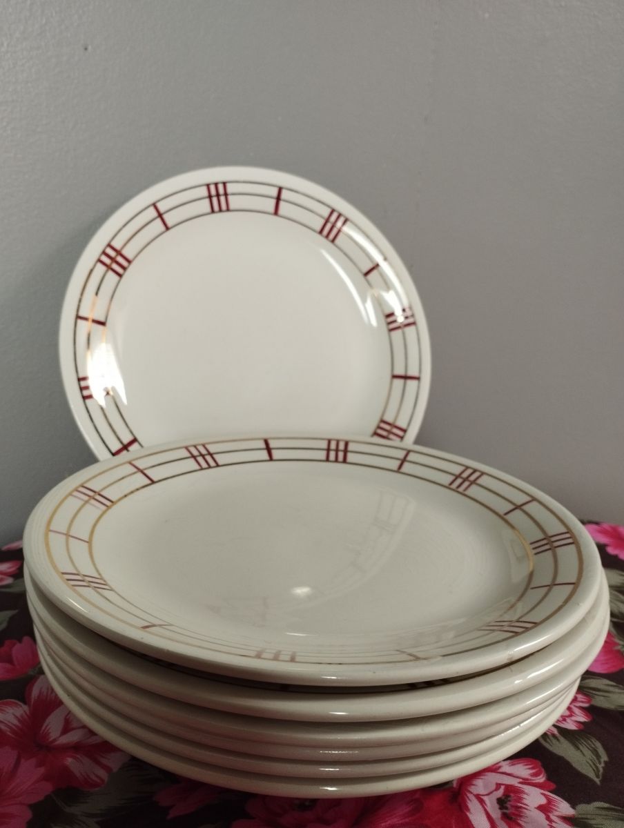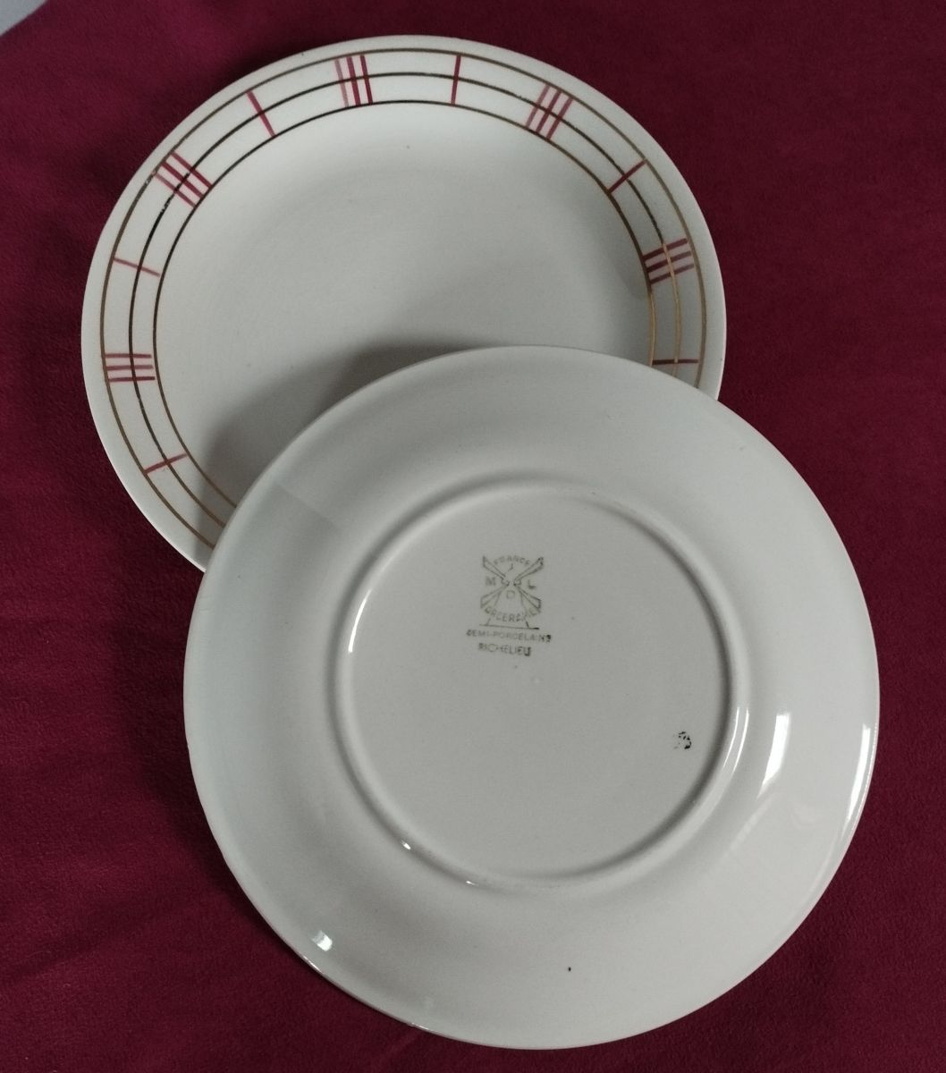 Ensemble de 7 assiettes à dessert au graphisme rouge et doré de Moulin des Loups, modèle Richelieu.