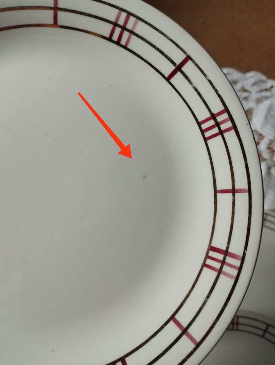 Très bel état, pas de fêle pas d'éclat, juste quelques marques d'usage liées à l'âge et un petit défaut d'email au sortir de la production sûrement ( cf fleche sur photo)
