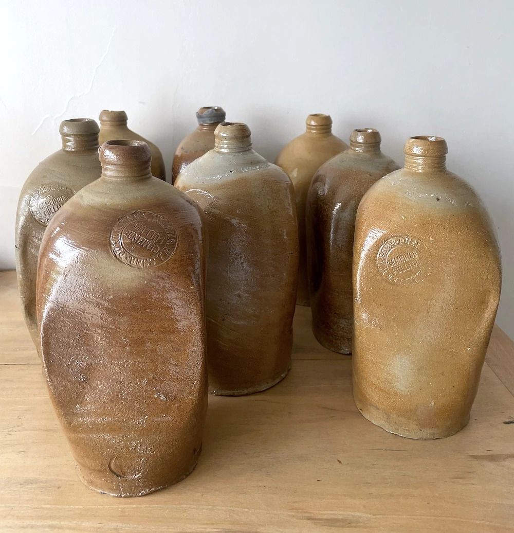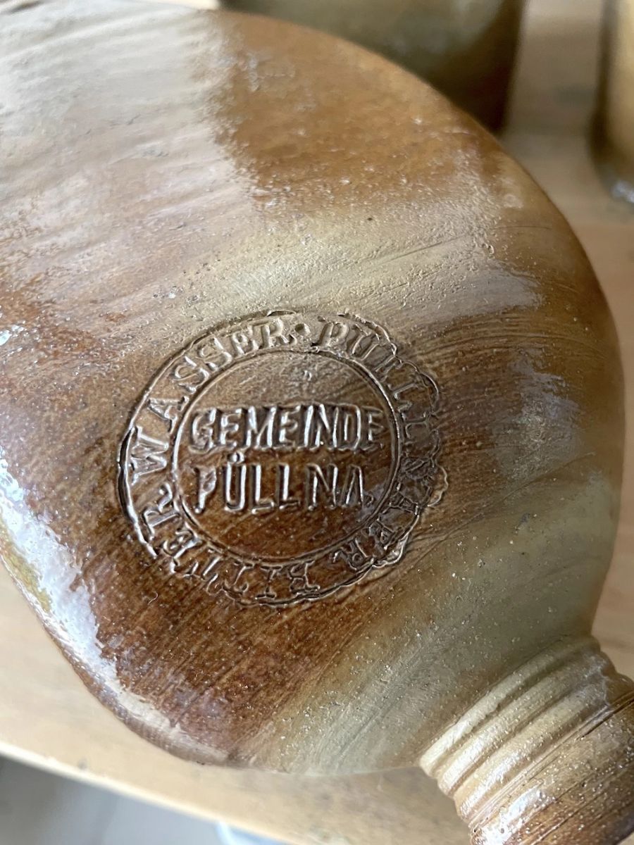 Disponibles en lot de 8 ou à l'unité (PRIX POUR UNE BOUTEILLE): Ancienne bouteille en terre cuite vernissée, portant le marquage "Pullnaer Bitterwasser Gemeinede Pullna" avec un cachet en relief distinctif. Elle témoigne du savoir-faire artisanal allemand et de la tradition séculaire de la poterie.