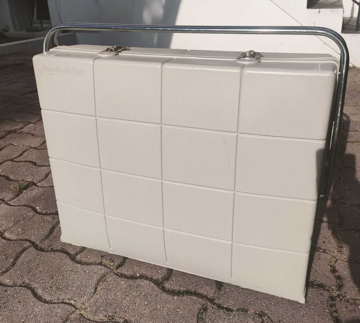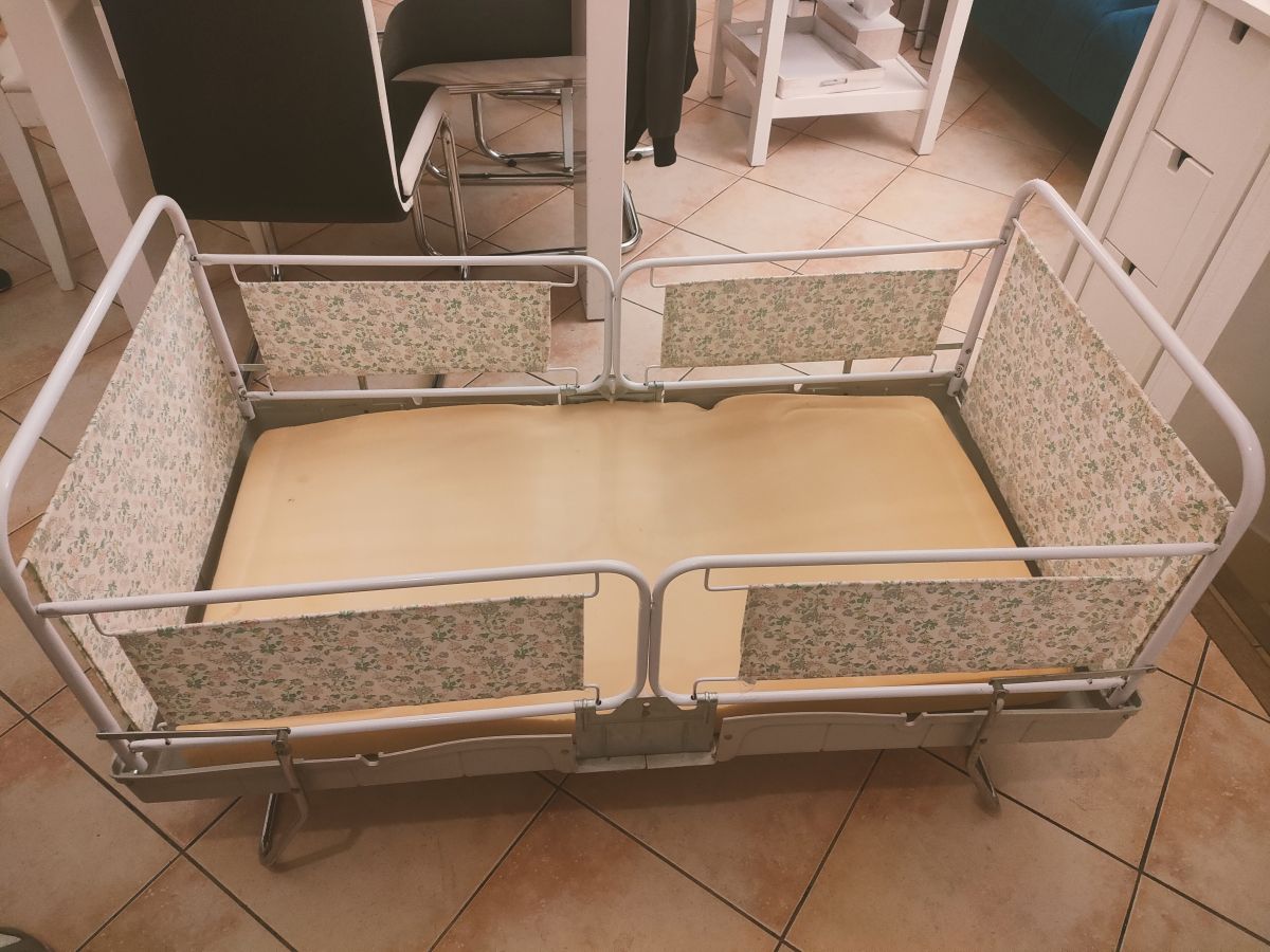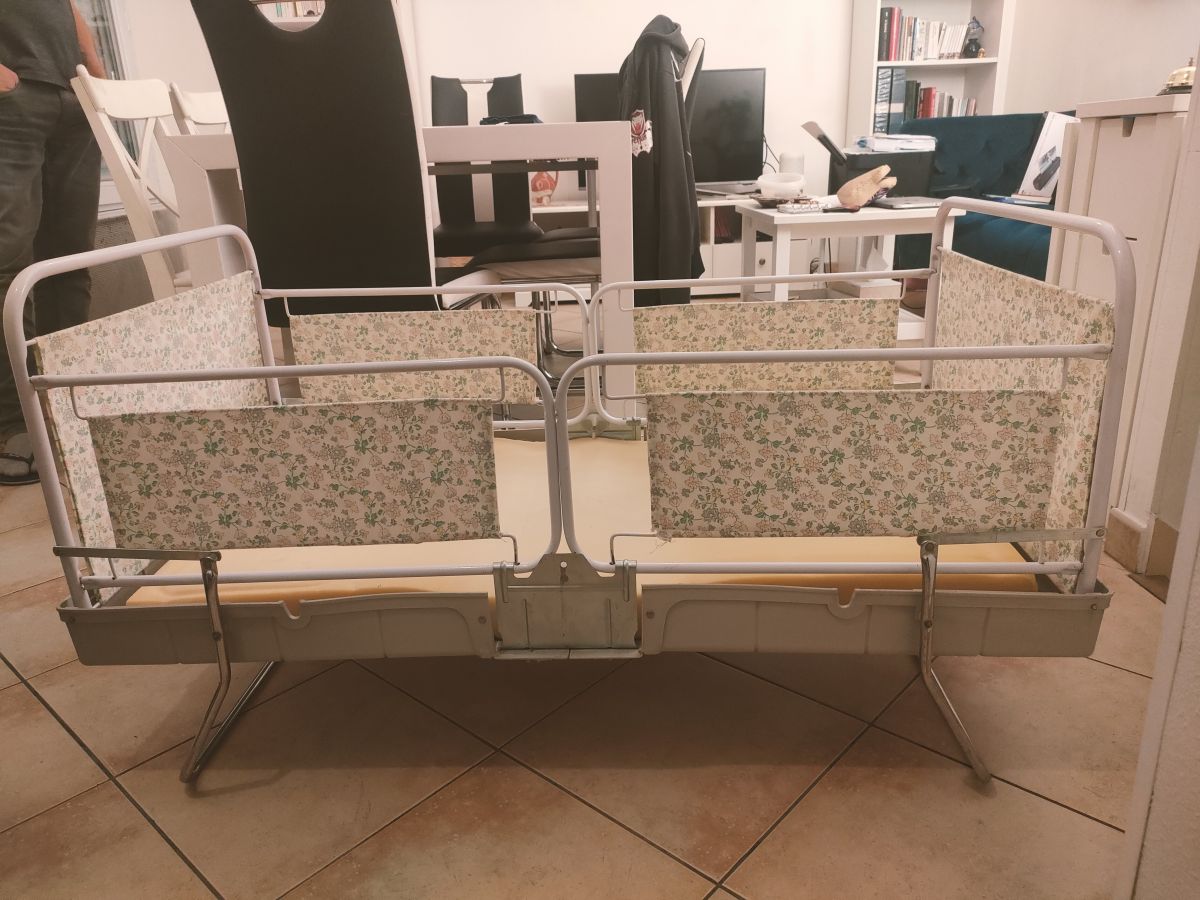 Un lit pliable (marque "Youpla-Do 2000") qui se range dans une valise, dont les poignées font office de pieds pour le lit une fois monté. Ce lit comporte un petit matelas, également des barrières de protection (armatures en métal, tendues de tissus), parfaits quand l'enfant est encore petit et risque de chuter. Le lit se déplie et se monte très facilement.