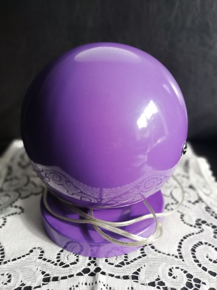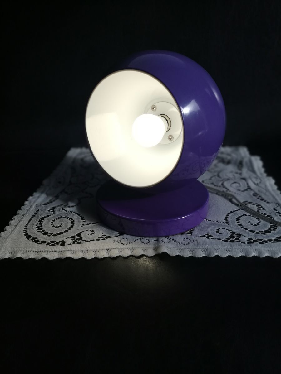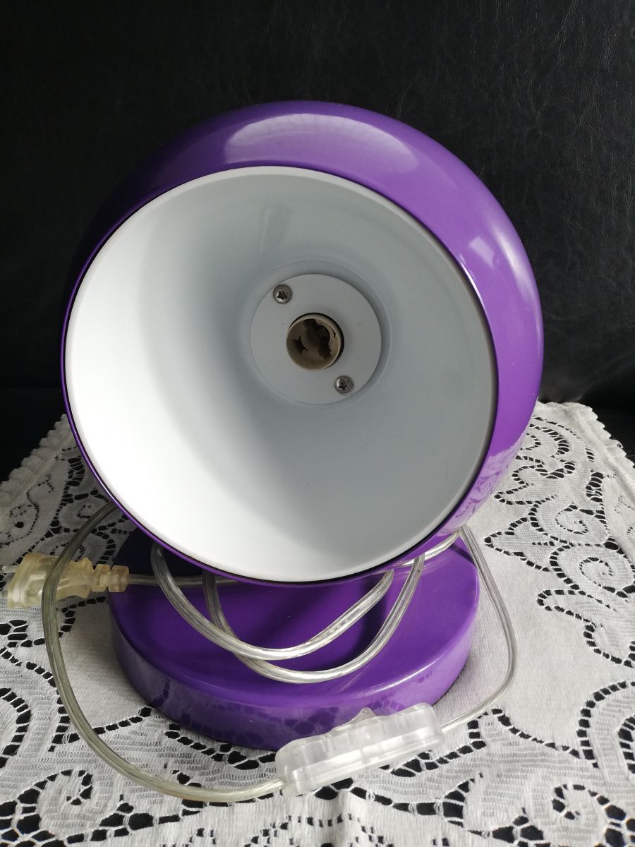 Lampe à poser ou à accrocher, style eye ball, space age de chez Agenor (etiquette sur socle) . Extérieur en métal laqué violet, couleur en vogue avec le orange dans les années 70,l'intérieur est en plastique blanc.