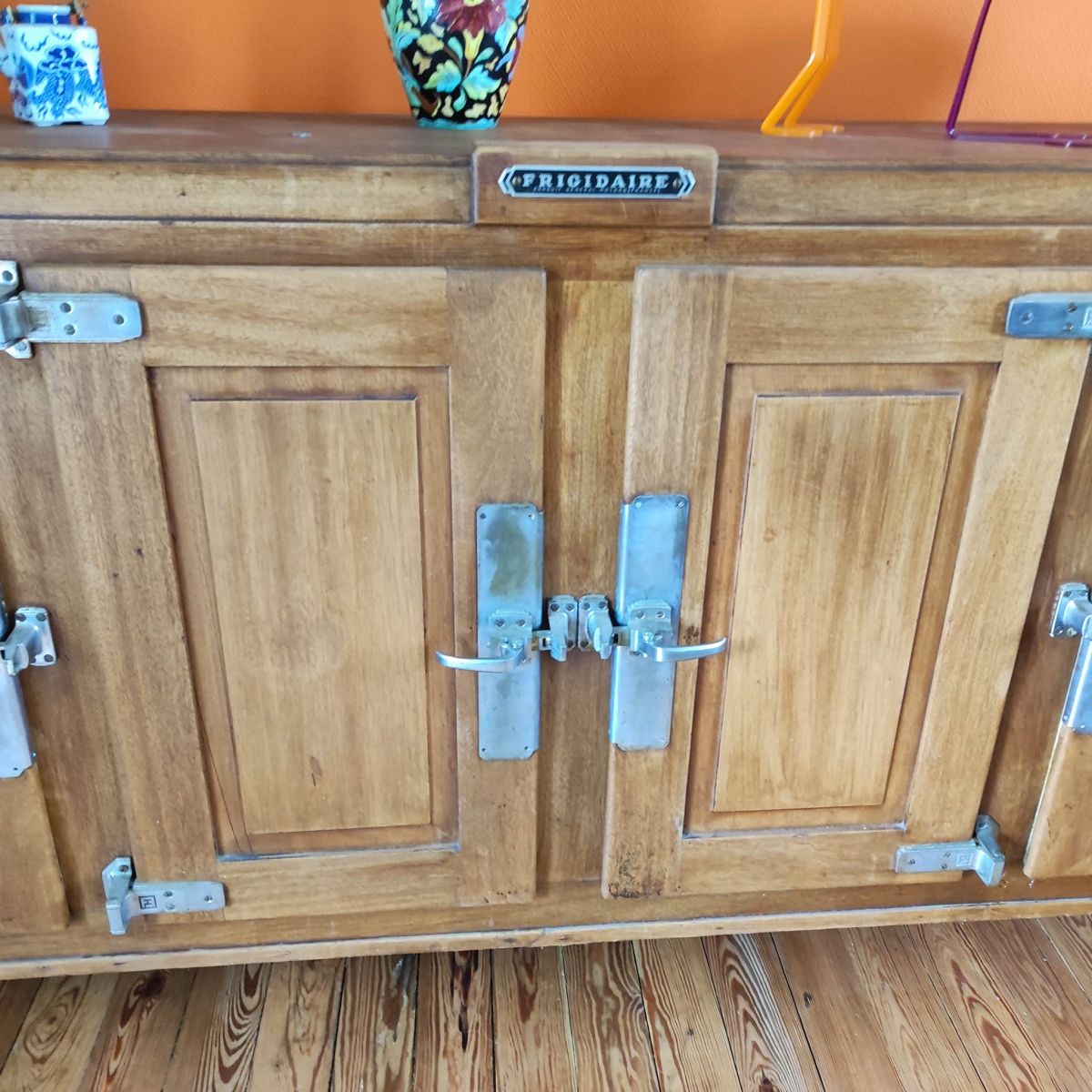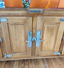 Grand frigo glacière, année 50, marque frigidaire. En très bon état. Le bloc moteur est toujours présent mais ne fonctionne pas. Vu sa grande taille, il est possible de l'utiliser comme buffet avec beaucoup de rangement.