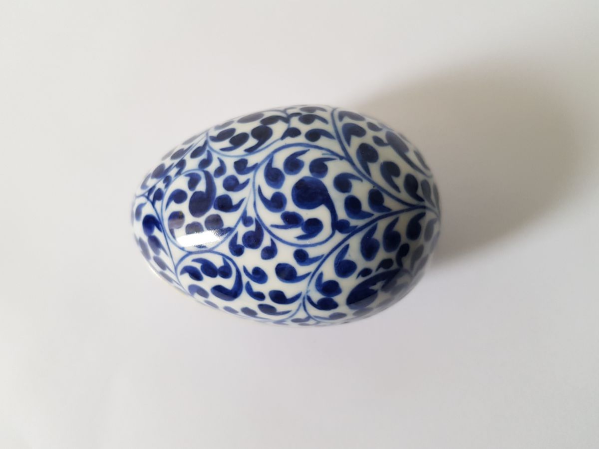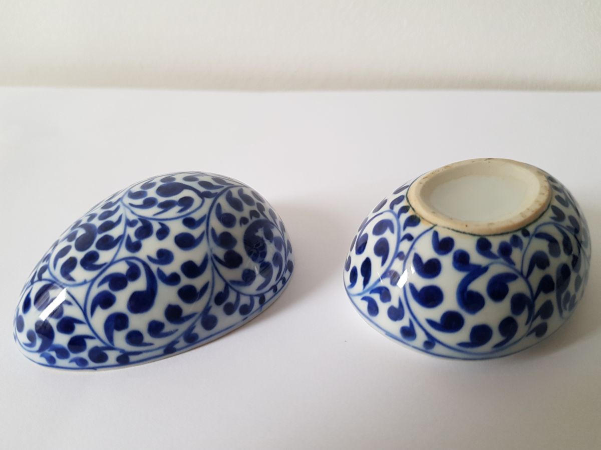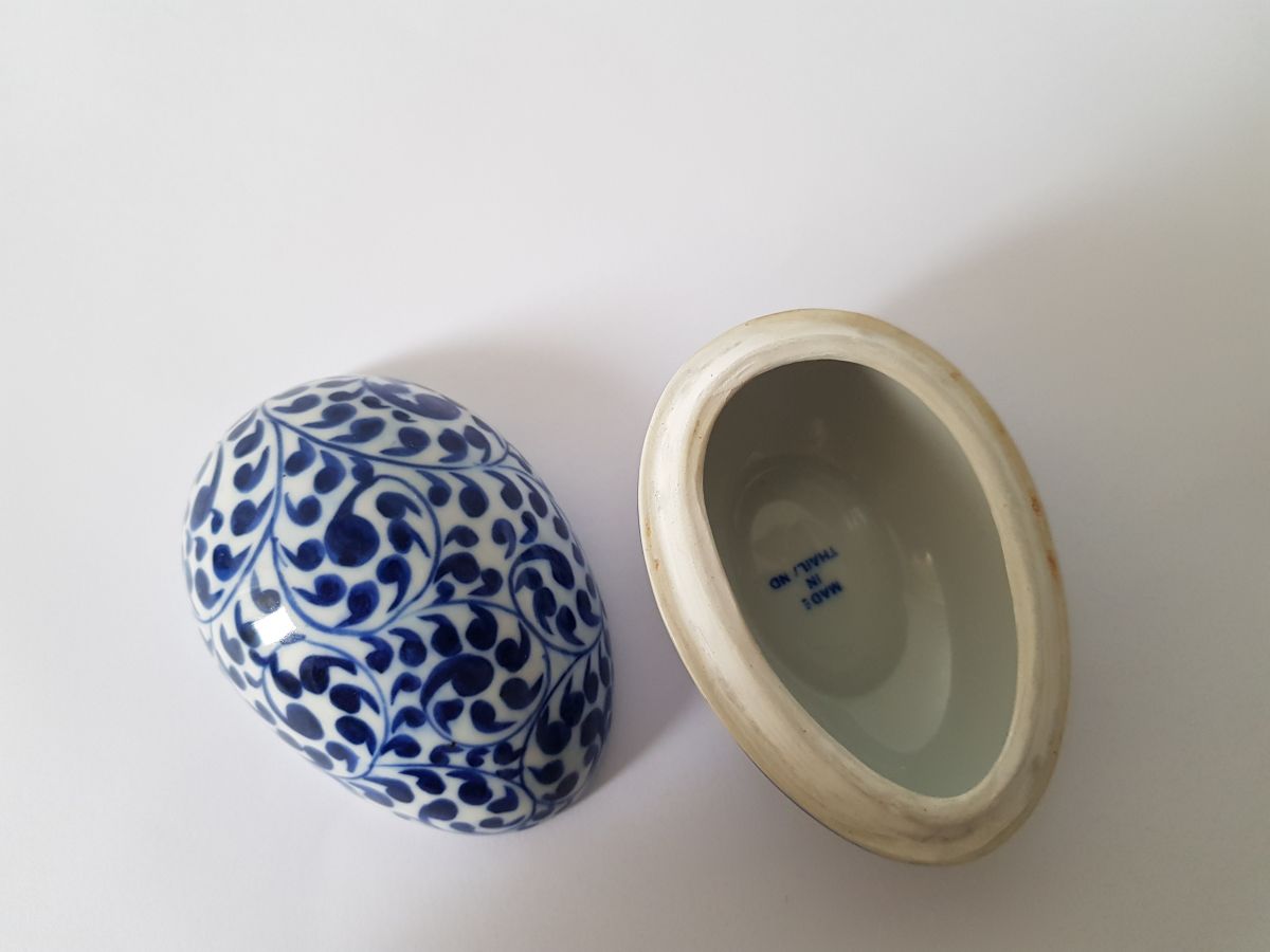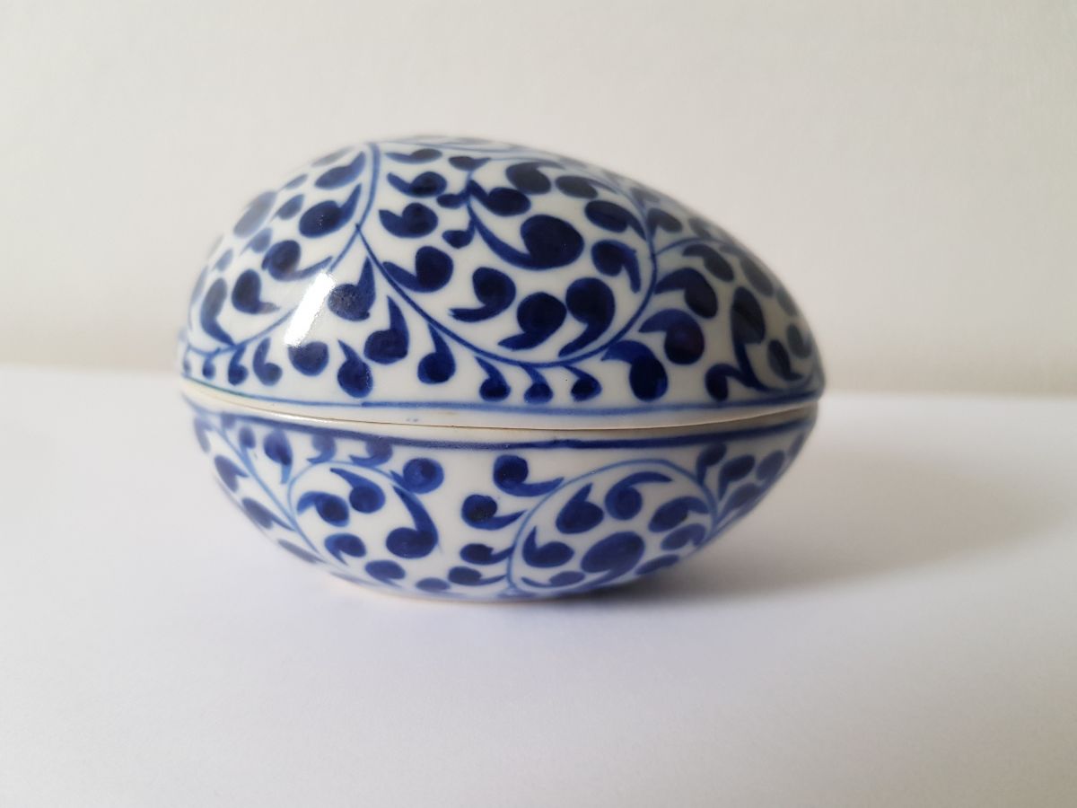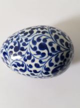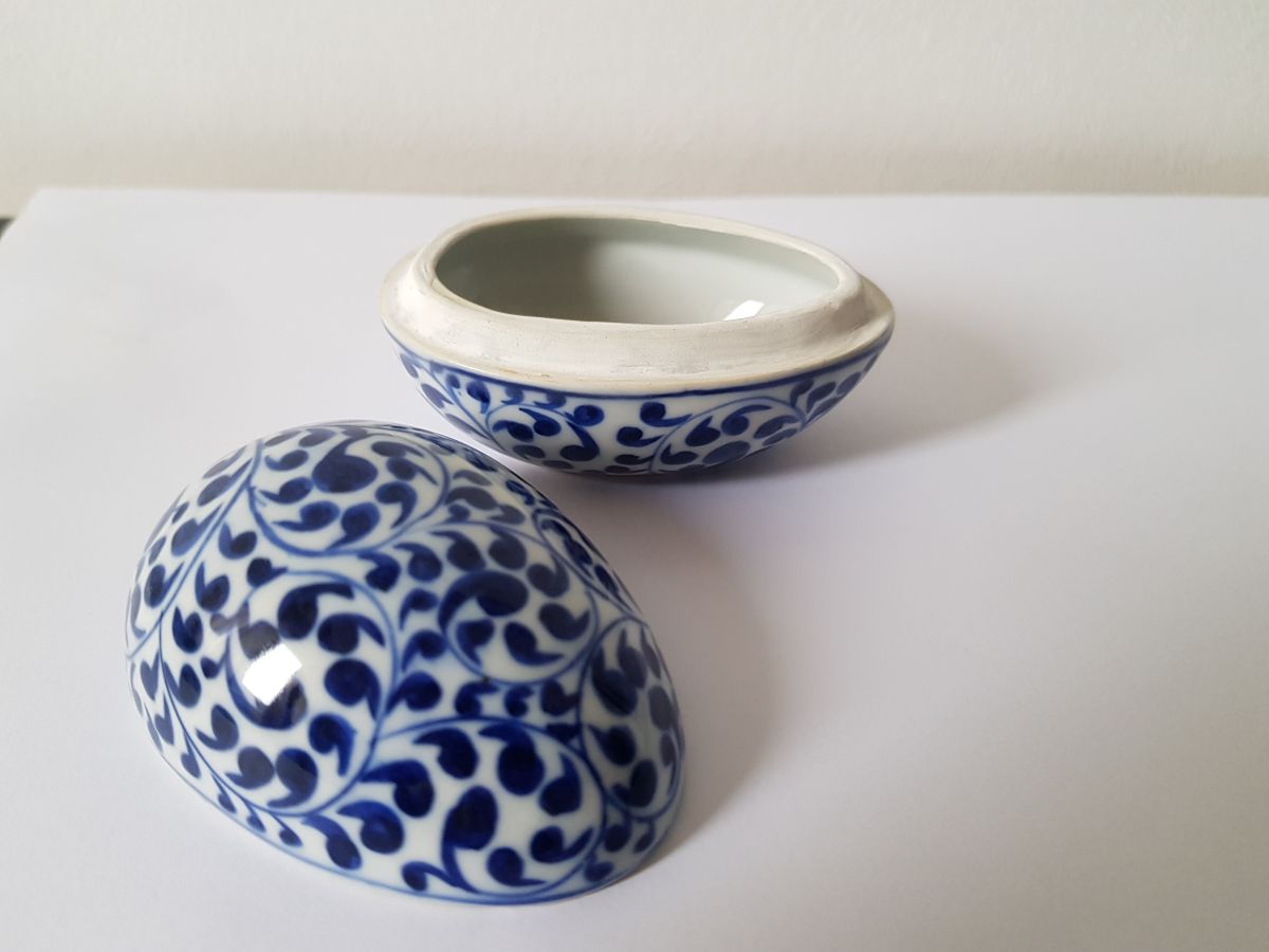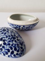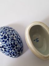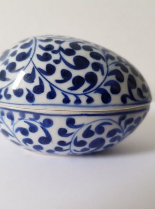 Petite boîte en céramique made in Thaïlande avec un joli décor intemporel bleu et blanc. Parfait état.