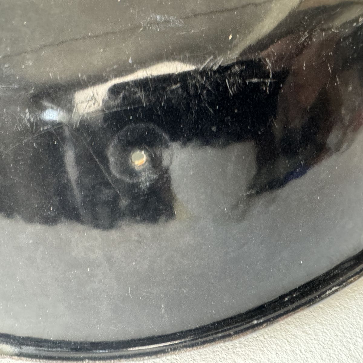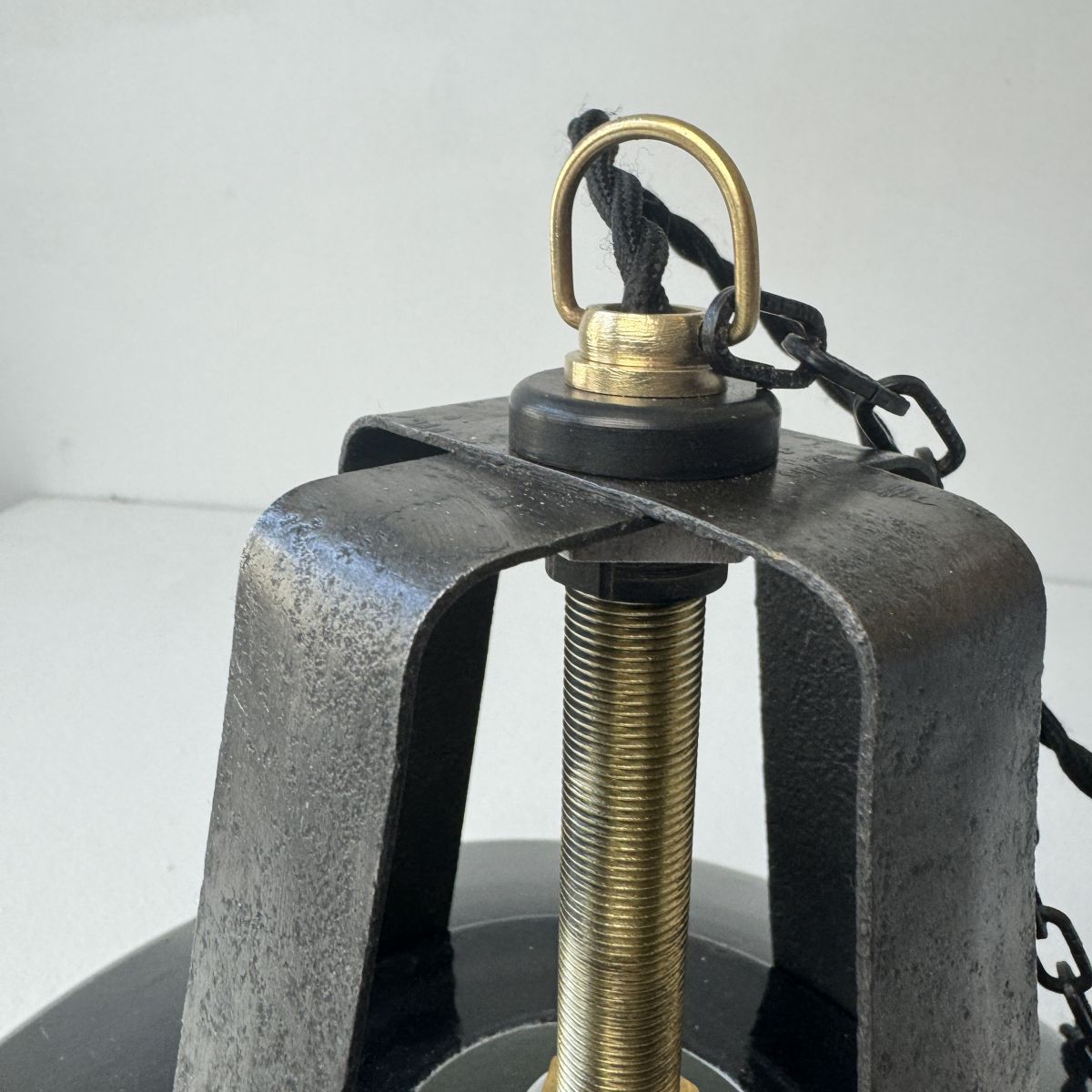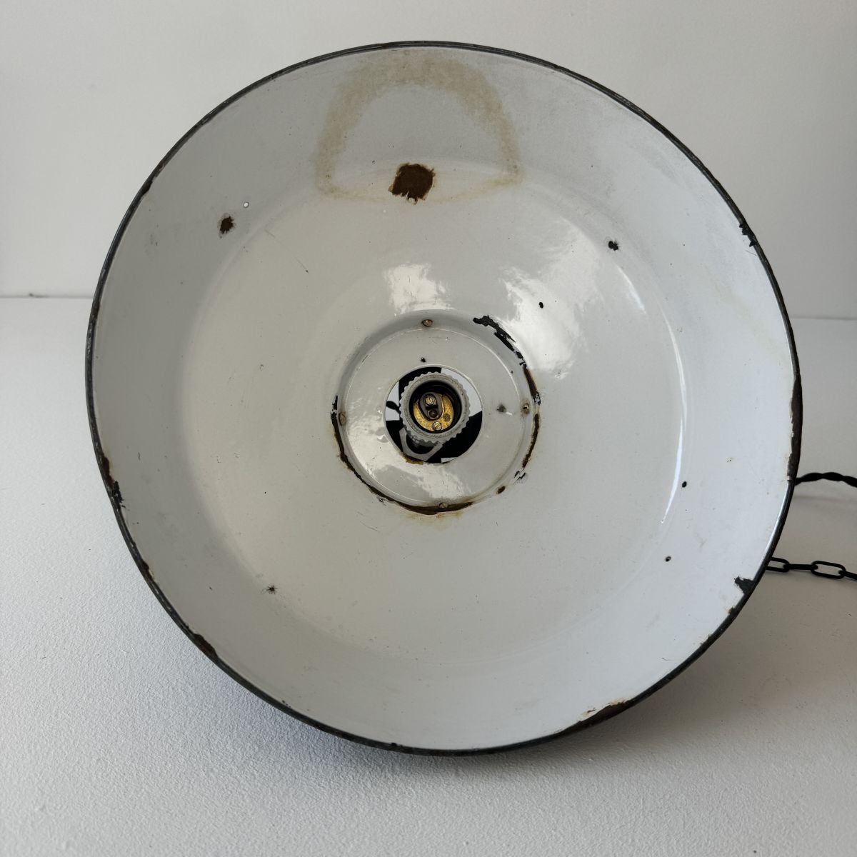 Belle suspension industrielle en tôle émaillée.  En bel état. Présente des traces du temps avec points de rouille et sauts d’émail. 2 trous d’origine (sans doute pour la fixation d’une grille)
