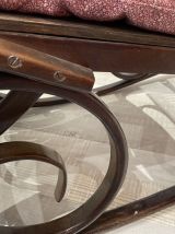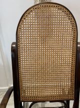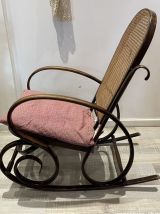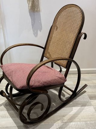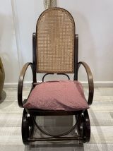 Rocking chair en bois et cannage des années 60, belle patine, coussin en tissu, assise en bois, dimensions (cm) : L.52xH.100xP.100, hauteur assise 45cm, assise 46x45cm, bon état.